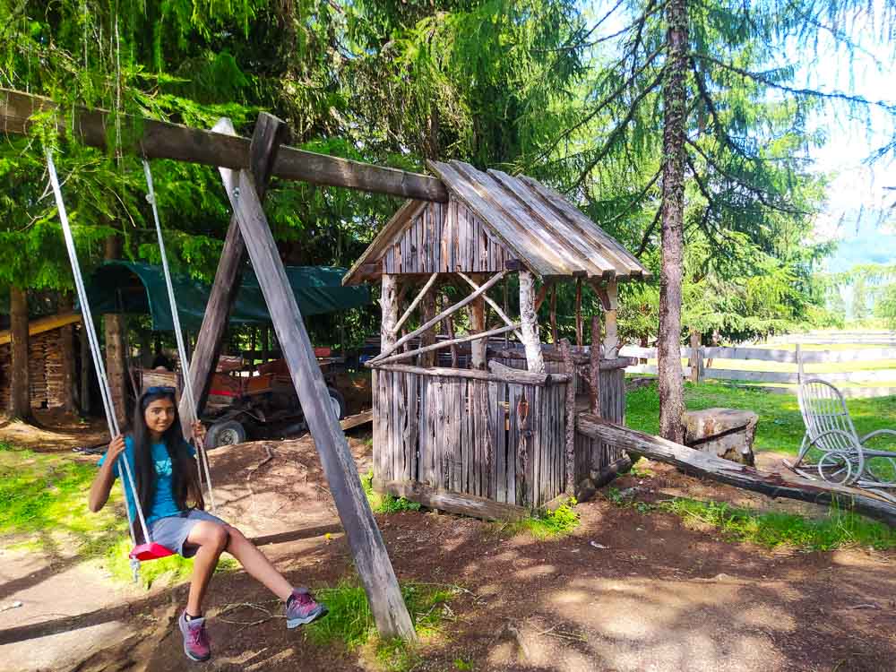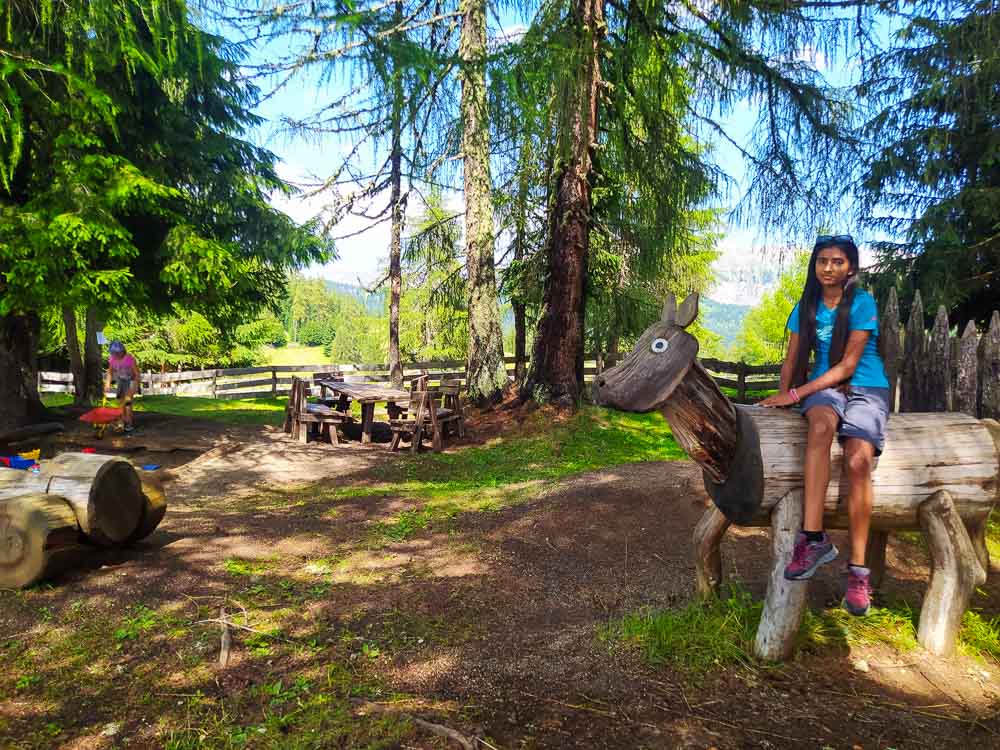 Sotto gli alberi c’è anche un piccolo parco giochi dove i bambini potranno passare dei momenti di svago mentre i genitori si riposano un po’ sulla terrazza a sbalzo sui prati, con vista sul Sass de Putia.