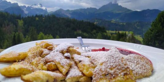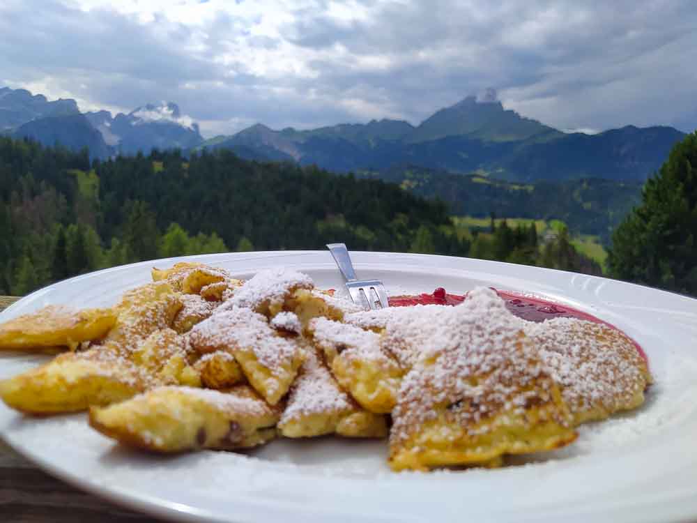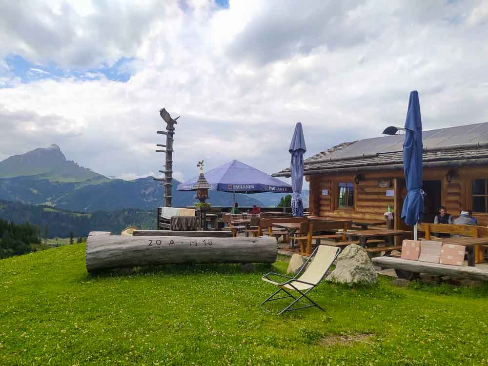 Carine le panche con cuscini e copertine, ed anche la statua in legno della marmotta. Il menù è quello della tradizione ladina ed i prezzi ci sono sembrati onesti. Kaiserschmarren, torta Sacher e sciroppo di sambuco promossi a pieni voti.
