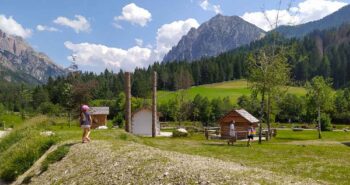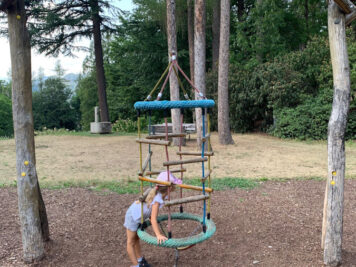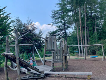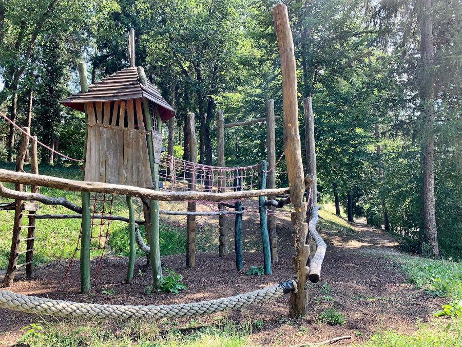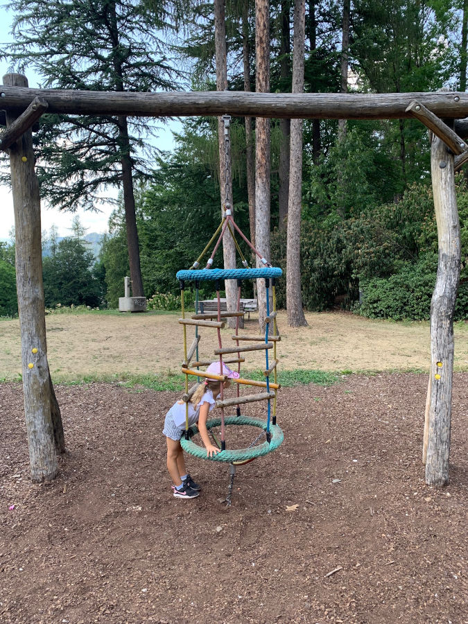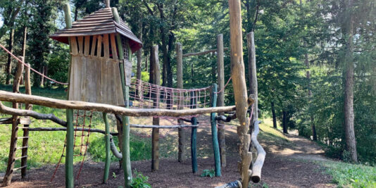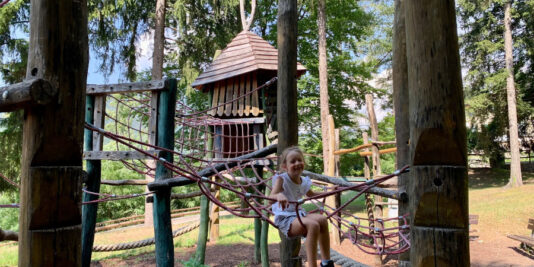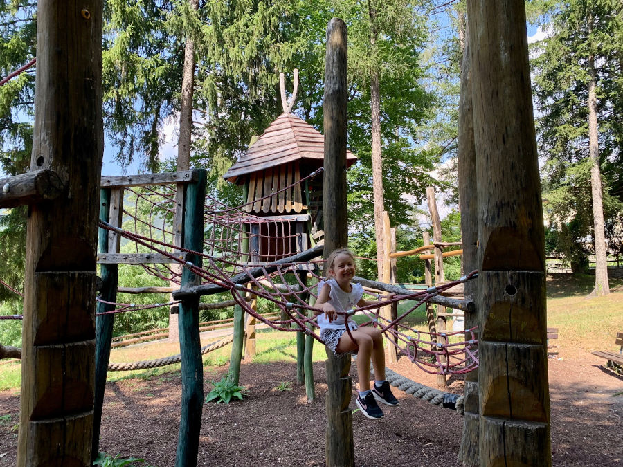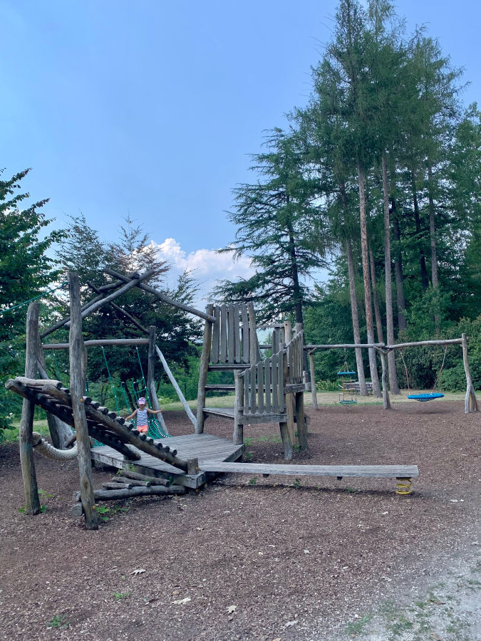 Salendo lungo la strada dall’ampio parcheggio incontrerete una prima area giochi con una grande costruzione in legno dotata di ponti traballanti, reti per arrampicare e percorsi di equilibrio.