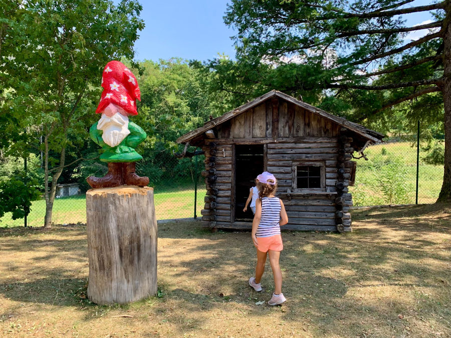 La seconda zona attrezzata è poco più sopra e ospita giochi più classici come altalene, scivoli, pareti da scalarea, dondoli, la casetta dello gnomo, un tavolo da picnic e una fontana.