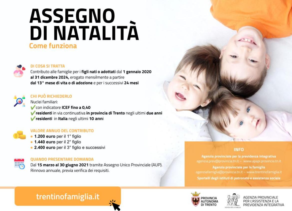 L’assegno è riconosciuto per la durata di 3 anni ed è incompatibile con l’analoga agevolazione prevista dallo Stato, erogata dall’INPS, per il primo anno dal mese successivo alla nascita o all’adozione. Per i figli nati o adottati negli anni 2020 e 2021, per i primi dodici mesi l’assegno è erogato dallo Stato e la Provincia riconosce l’assegno di natalità a decorrere dal 13° mese di nascita o adozione per i successivi due anni, con verifica annuale del mantenimento delle condizioni che danno diritto all’accesso.