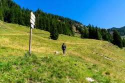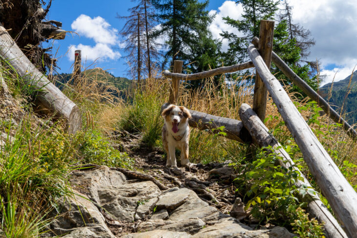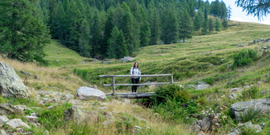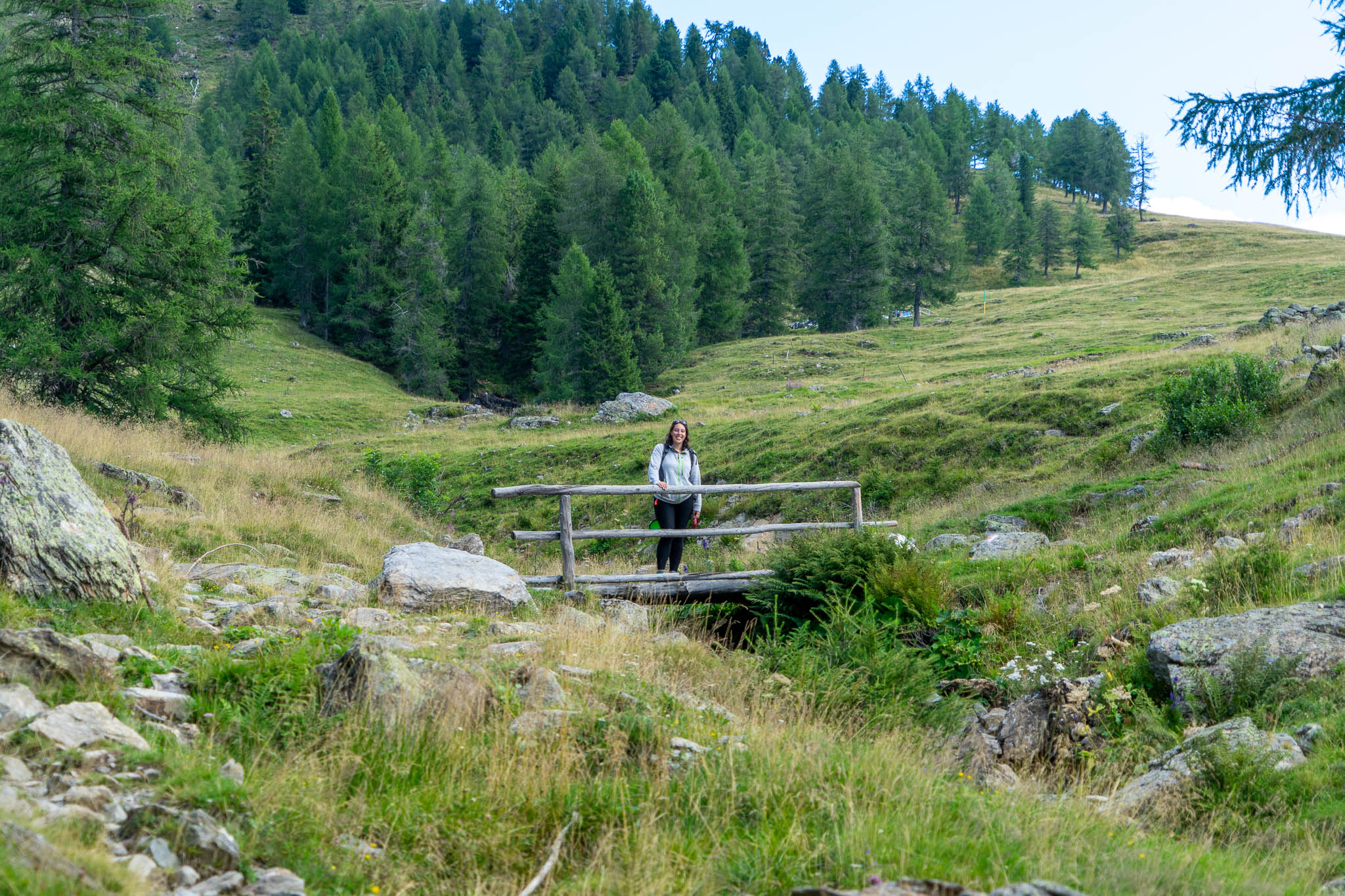 Dopo circa un’oretta di cammino, passato il ponticello in legno su un ruscello dove anche i nostri amici a quattro zampe possono abbeverarsi e godersi un po’ di fresco, riusciamo a intravedere la nostra destinazione, il Rifugio Malga Consèria!