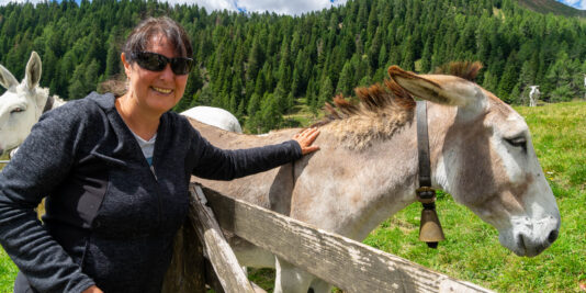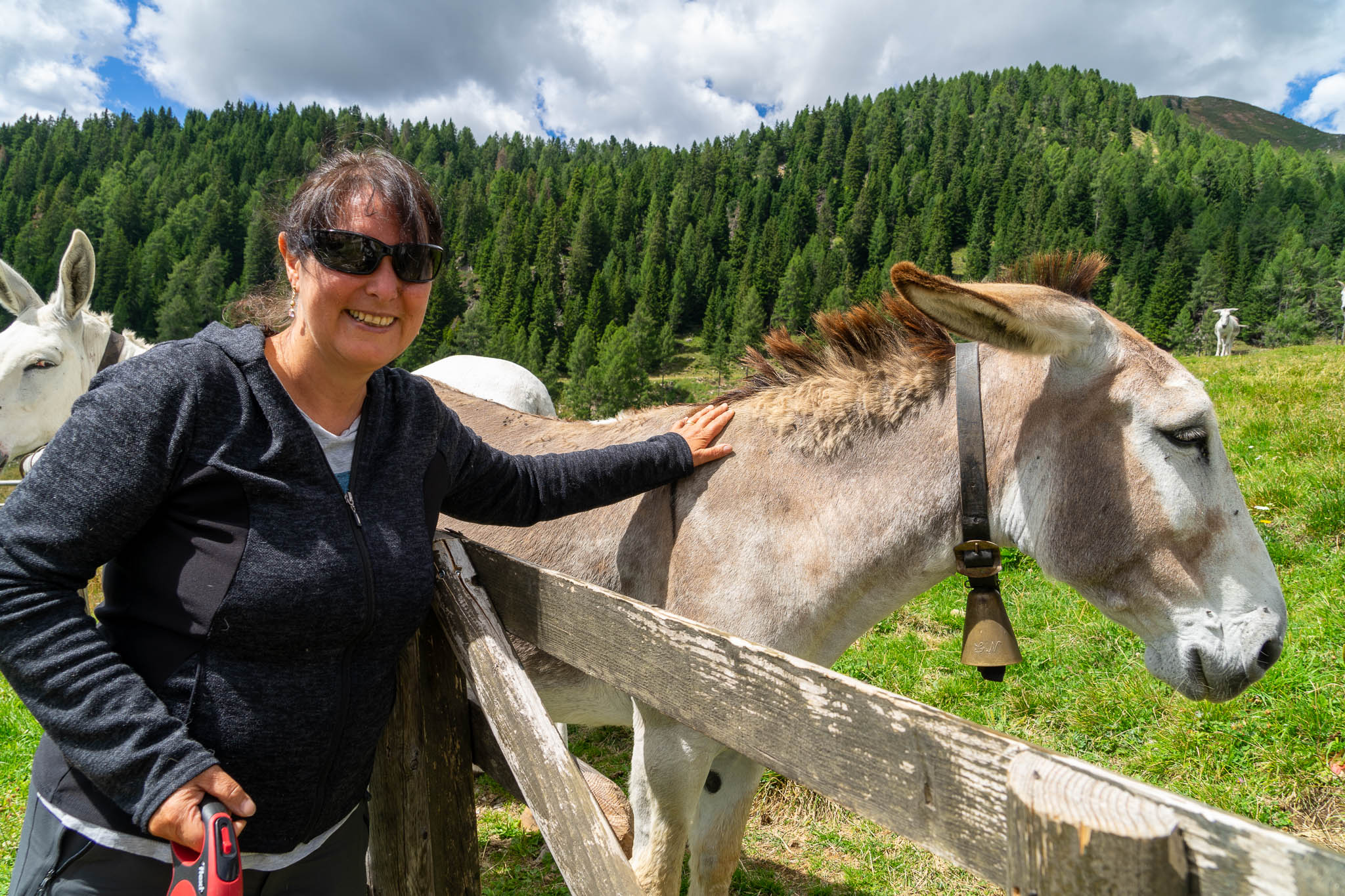 Dopo la meritata sosta, prima di riprendere il cammino, la nostra attenzione è stata catturata dai campanacci degli asinelli che pascolano in tranquillità proprio a fianco della malga e dobbiamo ammettere che da quassù il panorama è veramente splendido.