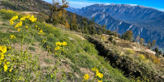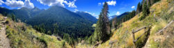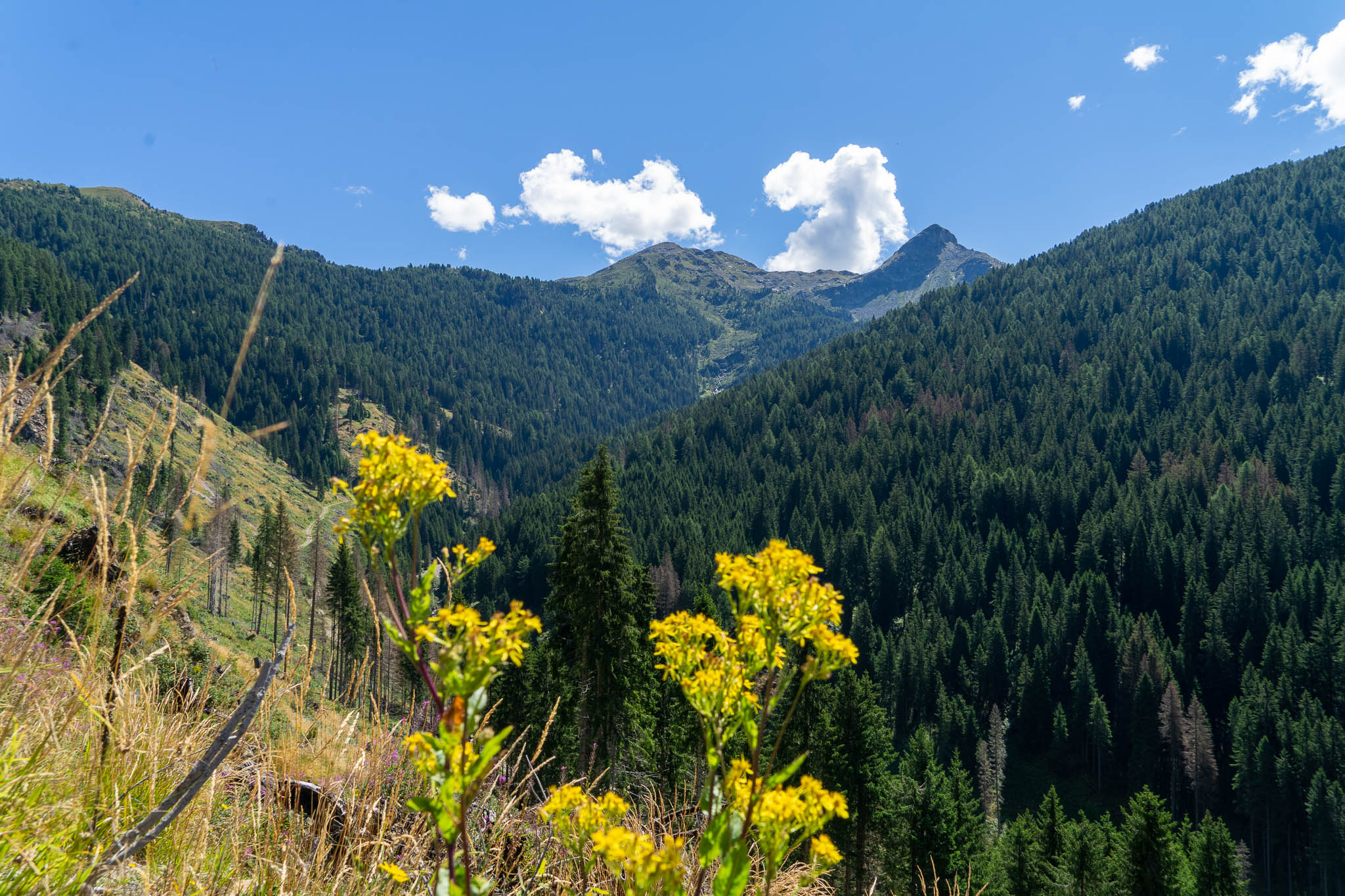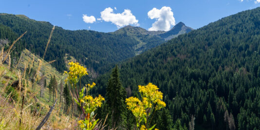 Il primo tratto ampio è immerso nei prati verdi, che costeggia cascatelle e rivoli d’acqua, e proseguendo man mano si trasforma in uno stretto sentiero sterrato, costantemente in leggera salita, circondato da piante e meravigliosi fiori spontanei. È proprio in questo tratto, sempre esposto al sole, che si scorgono le prime cime del magnifico Lagorai e rimaniamo a bocca aperta.