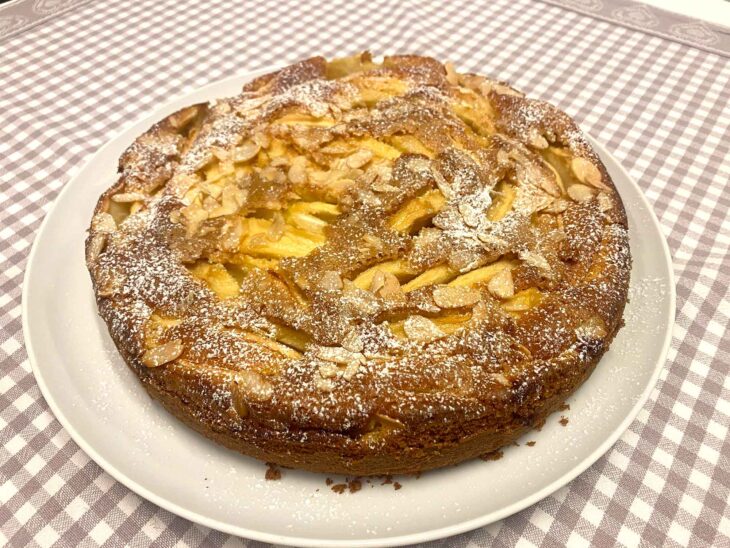 Versare il tutto nella tortiera precedentemente imburrata e infarinata (una tortiera grande va bene perché l’impasto si gonfia). Per decorare usare le fettine di mela a raggiera e le scaglie di mandorla. Il trucco in più? Mettere sopra qualche cucchiaino di zucchero di canna per creare un’ottima crosticina. Infornare per 35-40 minuti a 180 gradi, senza dimenticare la prova stecchino. Se quando lo infilate nella pasta della torta cotta esce asciutto, vuol dire che la torta è pronta per essere mangiata.