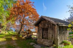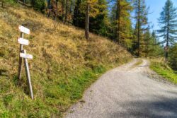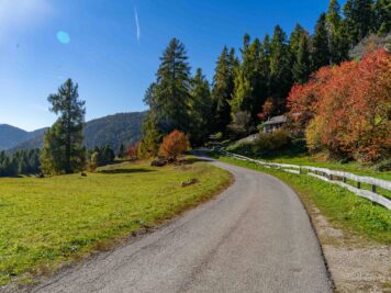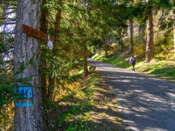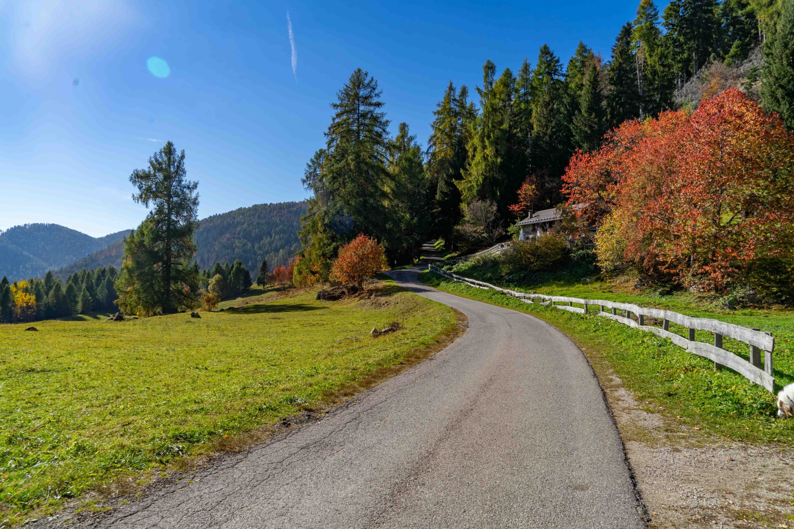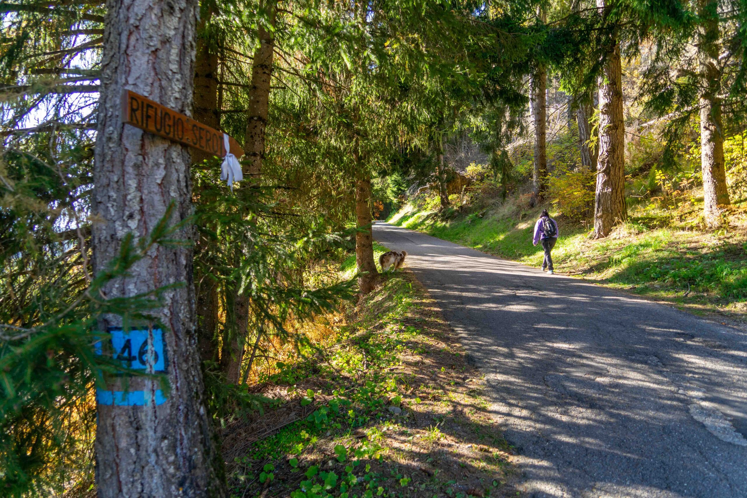 Si parte lasciandosi alle spalle il ristorante e ci si immerge in una magica atmosfera con le baite in legno che costeggiano la strada. Mano a mano che proseguiamo il bosco ci circonda e si possono ammirare i colori degli alberi che sono particolarmente variopinti nella stagione autunnale.