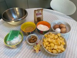 Montare le uova con lo zucchero in modo da rendere il composto spumoso poi aggiungiamo il burro che abbiamo precedentemente fatto fondere sul fuoco e fatto raffreddare. Procediamo poi incorporando le farine, poco per volta per non formare grumi. Per ottenere una torta soffice vi consigliamo di aggiungere un goccio d’acqua o di latte se l’impasto che ottenete si addensa troppo in modo da ottenere un composto morbido ma consistente. A questo punto aggiungiamo le mele a pezzetti e le noci spezzettate e le incorporiamo delicatamente nell’impasto.