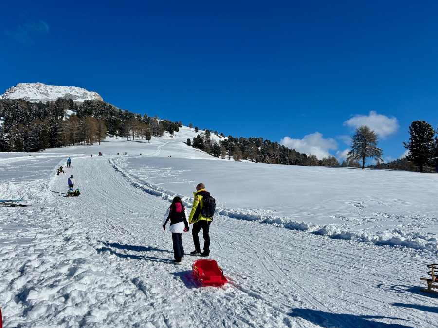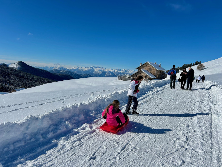 Dopo pranzo per i bambini il divertimento continua sulla neve fuori dalla malga: sarà difficilissimo convincerli a proseguire la passeggiata. Tra discese con lo slittino, pupazzi di neve e gli animali della stalla.. gli adulti si rilassano sulle sdraio al sole.