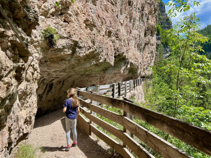 Lasciate la macchina nel grande posteggio a poca distanza dal ponte sospeso e poi seguite le indicazioni. Dopo un tratto in piano, che costeggia l’area camper Al Plan, si sale per una ventina di minuti nel bosco. Ricordate che nei periodi di alta stagione è un percorso molto gettonato, per questo vi consigliamo di godervelo in primavera e in autunno.