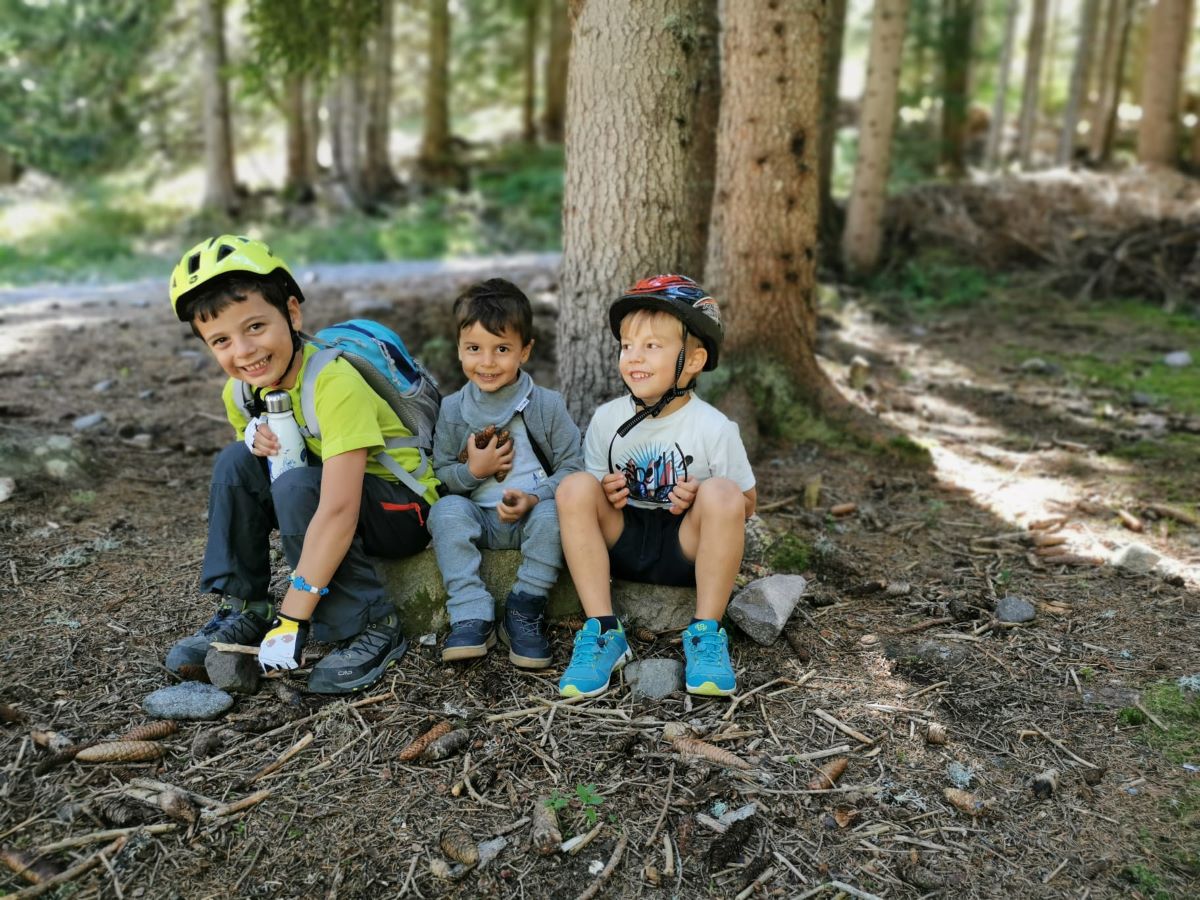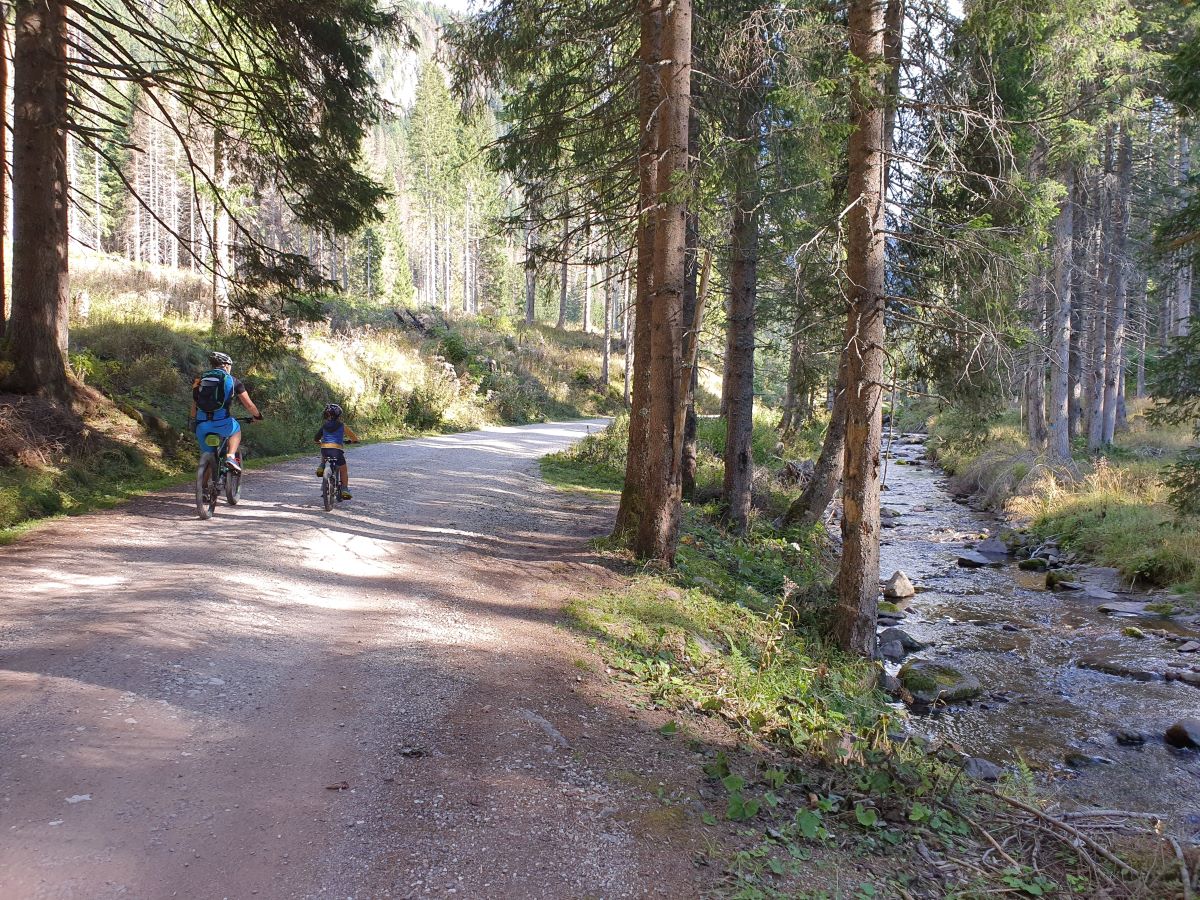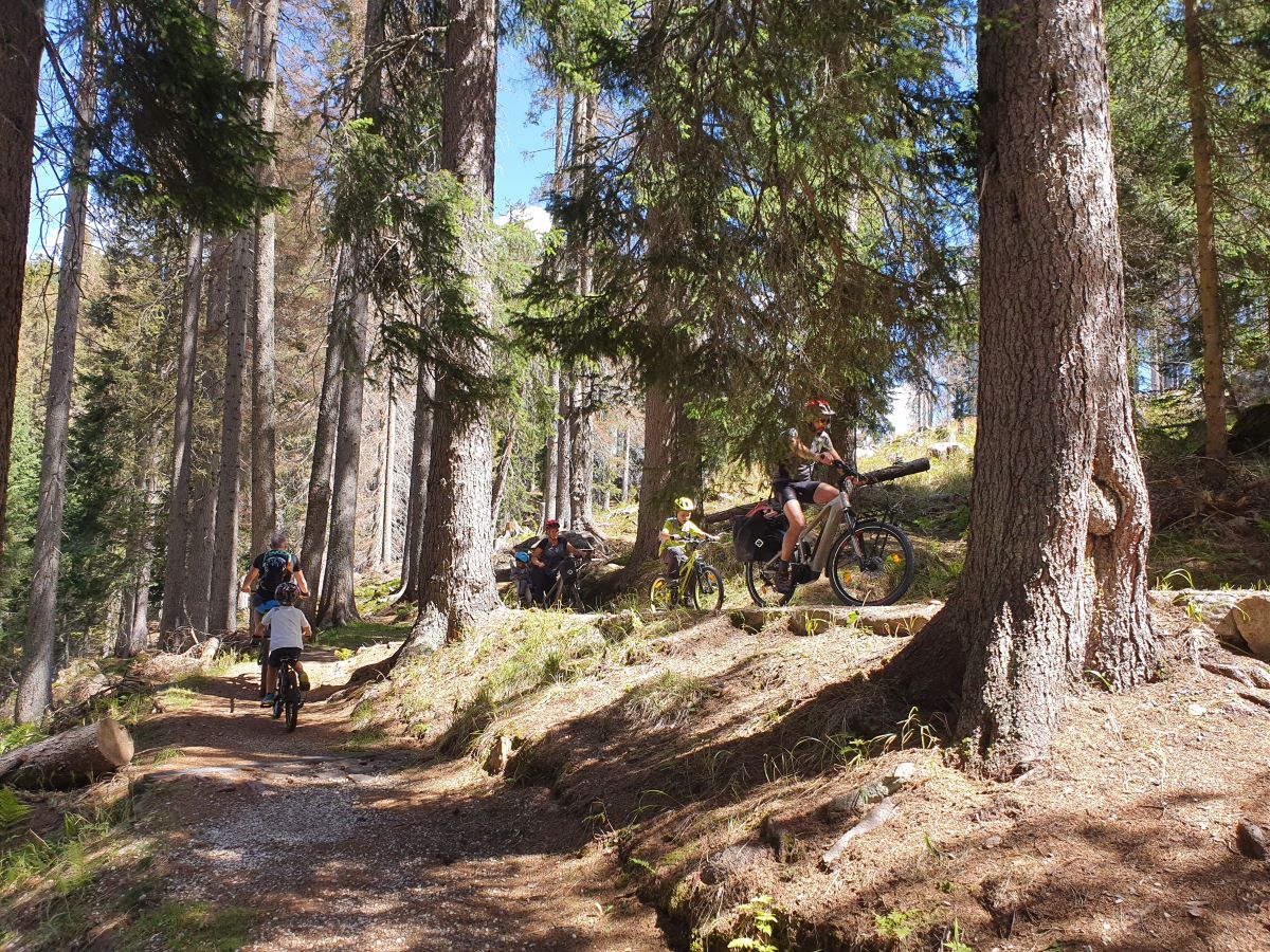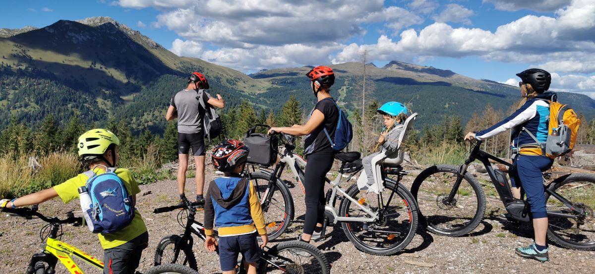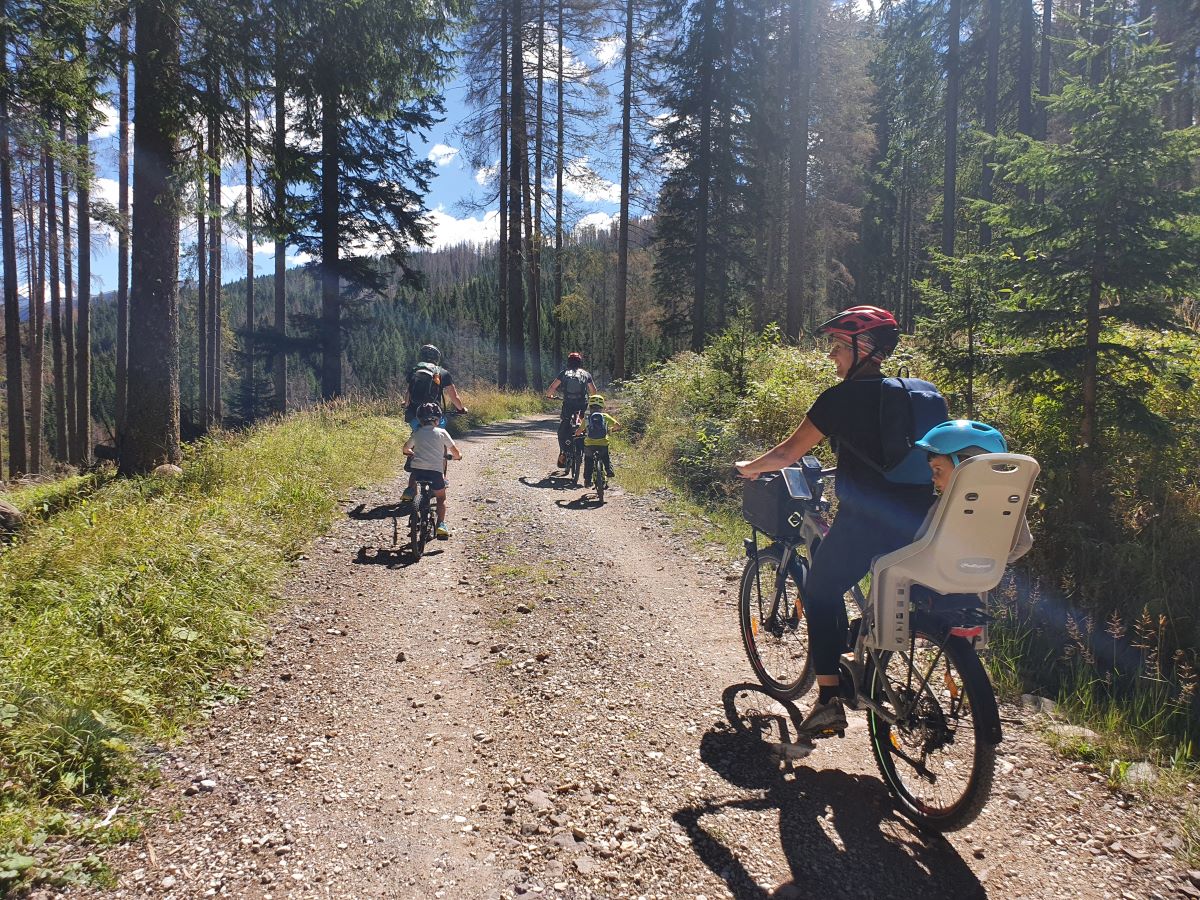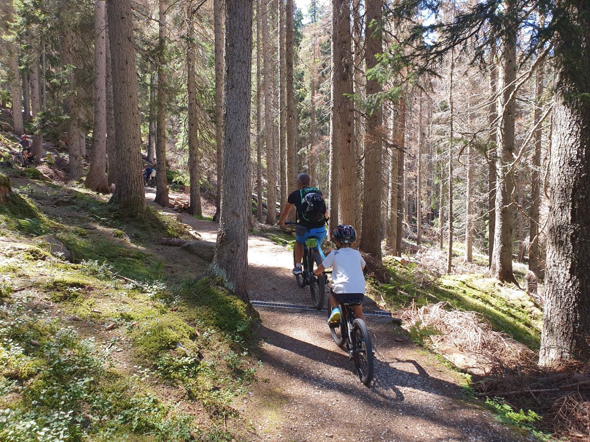 Dopo circa tre chilometri, la strada forestale si trasformerà in un sentiero a tornanti nel bosco, sufficientemente largo per passare tranquillamente sia con bici che con passeggino. Noi, come tutto il resto della salita, l’abbiamo affrontata trainando i bimbi in bici con la corda elastica agganciata alla nostra e-bike.