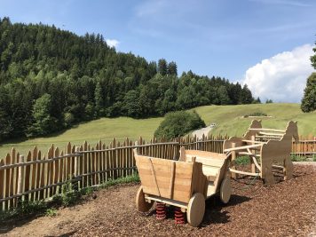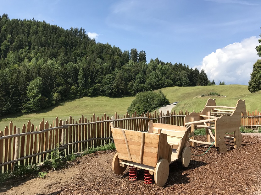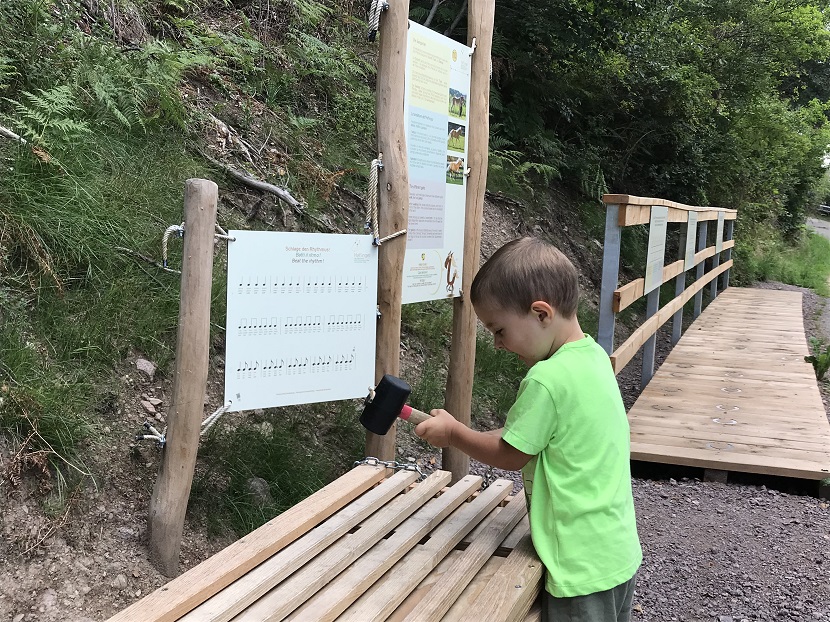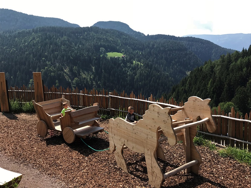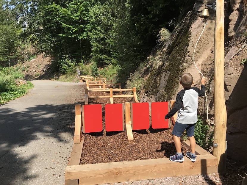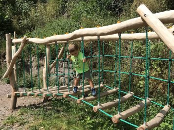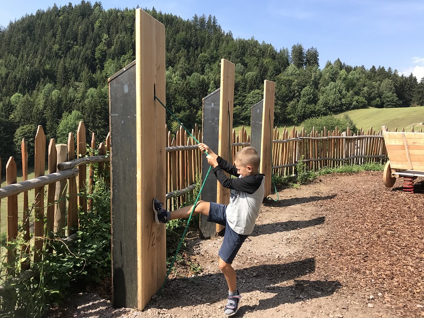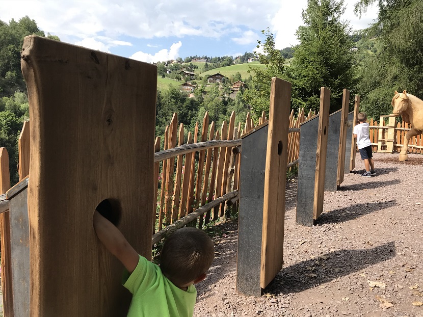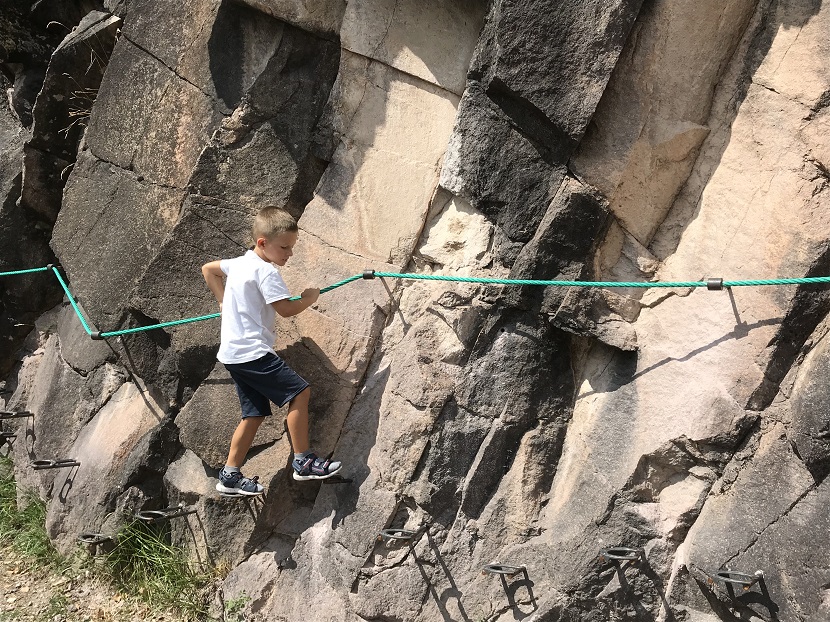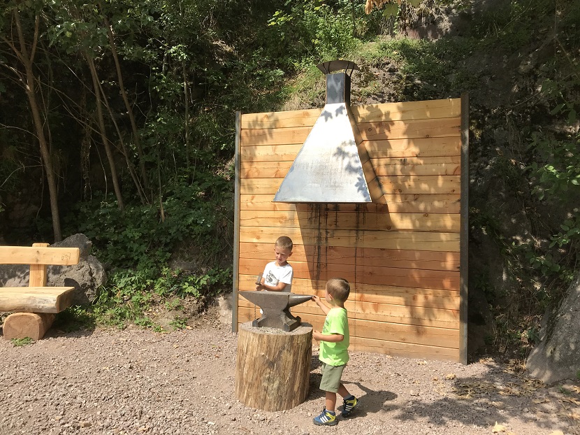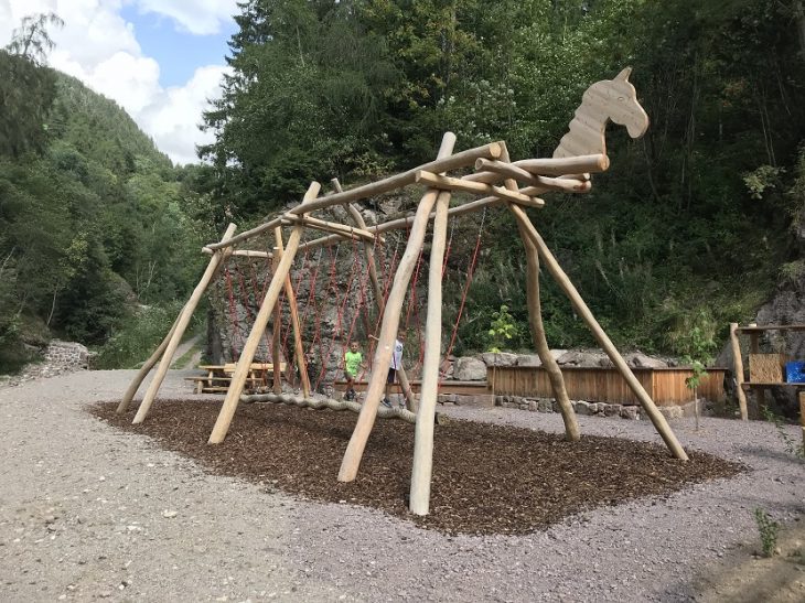 …una “vecchia fucina”, dove i bambini possono provare a “forgiare” un ferro di cavallo, un percorso sospeso sulla roccia, come una piccola ferrata a misura di bambino, e ancora un bel percorso di equilibrio …