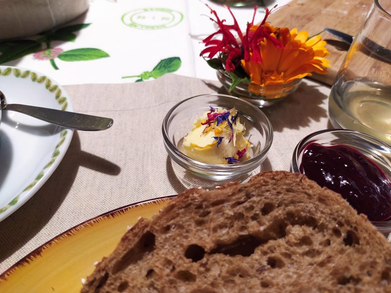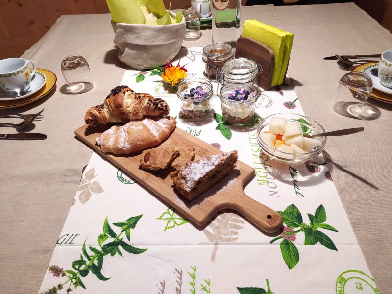 Ad attendervi al mattino una gustosa colazione preparata da Chiara con prodotti locali (burro, latte, uova, ricotta, salumi, formaggi: ottima anche la caciottina ErbaMaga ai fiori eduli preparata in esclusiva dal Caseificio Cercen), panificati freschi, ottime torte fatte in casa… e poi marmellate, succhi, tisane, granelle e addirittura dei coloratissimi fiori, tutto proveniente dall’azienda agricola di famiglia che si trova a pochi chilometri di distanza, in località Pracorno. Qui, con metodi biodinamici, vengono coltivate piante officinali ed orticole e dimorano anche le utilissime api.