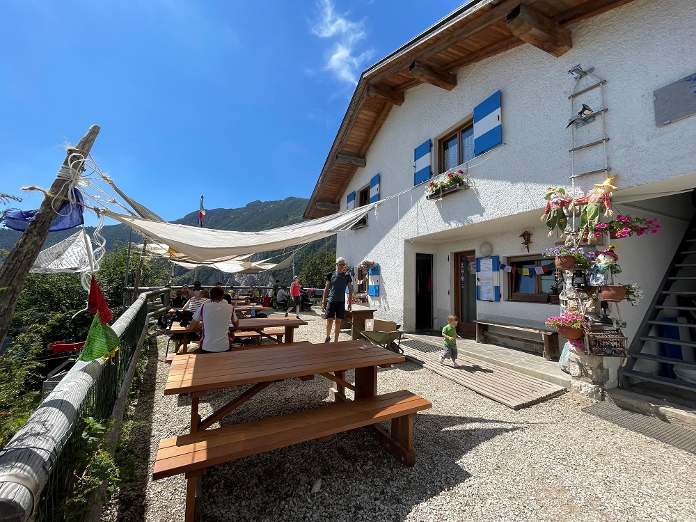 Una volta usciti dal bosco vi troverete davanti il rifugio e le cime che lo sovrastano, tra cui il Becco di Filadonna e il bel panorama che da sull’Altopiano di Folgaria e Lavarone.