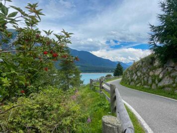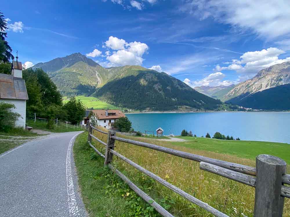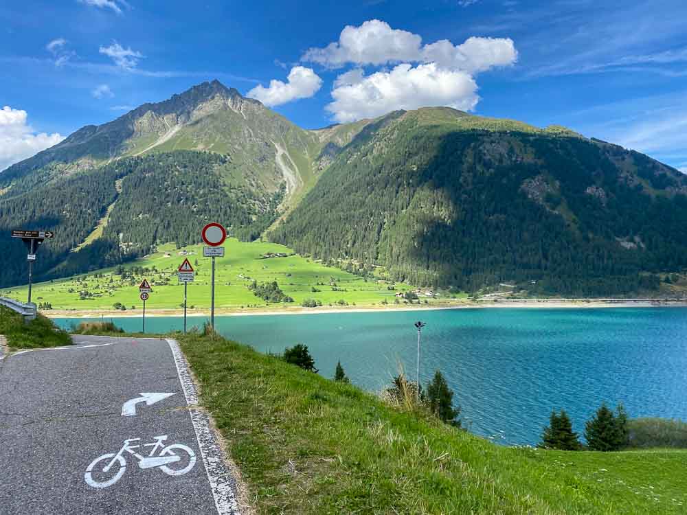 Finita la pausa post pranzo, siamo scesi con la telecabina fino ad arrivare al paese di San Valentino. Eravamo curiosi di percorrere parte della ciclabile della Val Venosta, che – nel verso contrario – porta fino a Merano, e così abbiamo costeggiato la sponda occidentale di questo lago artificiale. Un paio d’ore di piacevole camminata praticamente pianeggiante su asfalto, con anche una bella visuale sul famoso campanile sommerso.