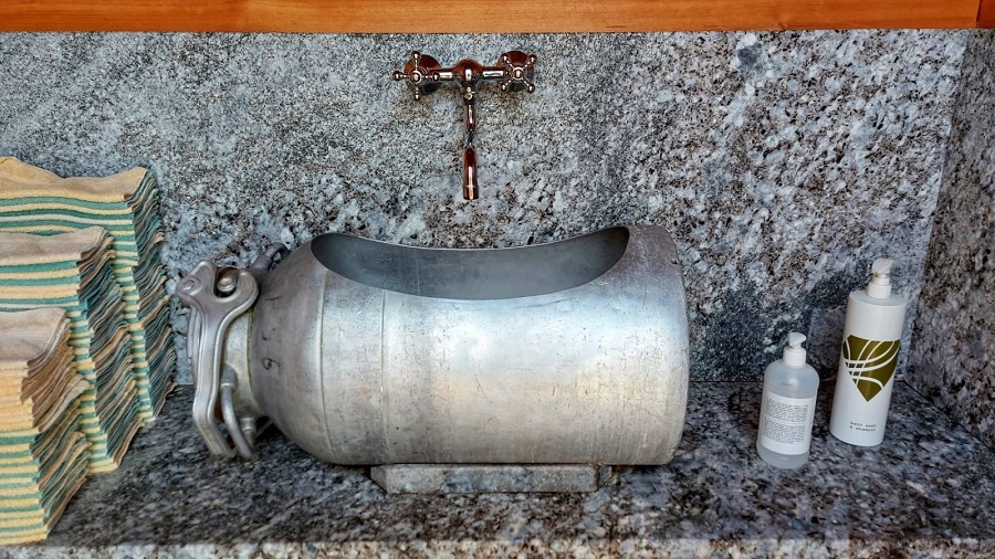 Oltre alle bellissime fioriere in legno, il prato tagliato a regola d’arte e le splendide sculture raffiguranti aquile e stambecchi, ad attirare la nostra attenzione il lavabo del bagno ricavato da un bidone del latte, davvero molto caratteristico.