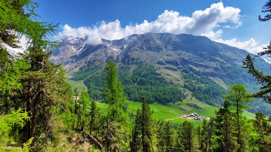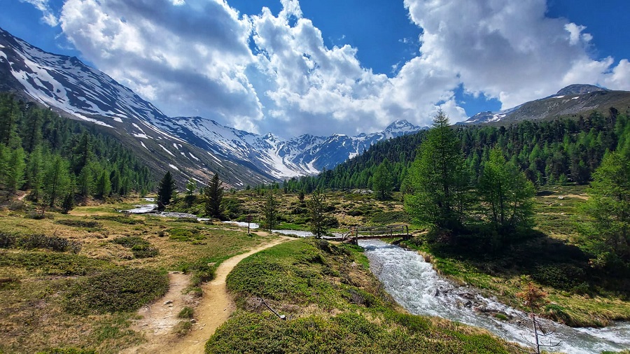 Una volta terminata la salita iniziale, il resto del percorso è sempre in leggero saliscendi molto piacevole, che ci porta dapprima nella splendida e verdeggiante Val di Lagaun, con gli ultimi segni delle abbondanti nevicate invernali e un bel torrente con un ponticello in legno da attraversare.