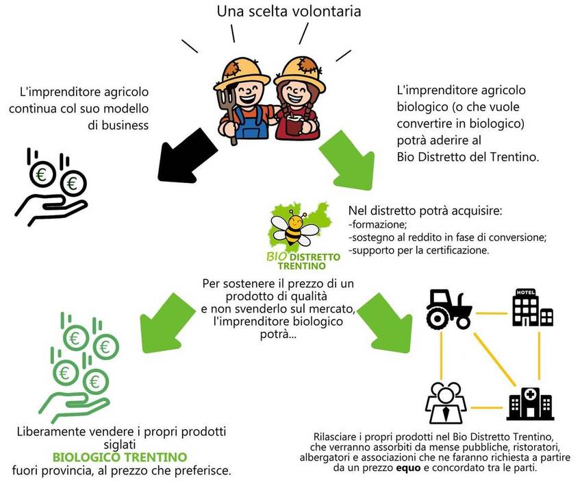 Il biodistretto vuole rispondere proprio a questa domanda e vuole essere un patto territoriale tra agricoltori, cittadini ed ente pubblico, in questo caso la Provincia Autonoma di Trento, che regola la fornitura alimentare di mense di asili, scuole, aziende, ristoranti ecc… Sono in fatti questi luoghi in cui l’ente pubblico porta i prodotti biologici, ma l’offerta biologica del Trentino, come già detto è attualmente troppo scarsa per accontentare tutte le richieste e così capita che ai nostri bambini vengano sì somministrati prodotti biologici, ma acquistati fuori dal Trentino con conseguente allungamento della filiera, aumento dei costi e svantaggio per l’economia interna e per il portafoglio dell’ente pubblico, ma soprattutto delle famiglie.