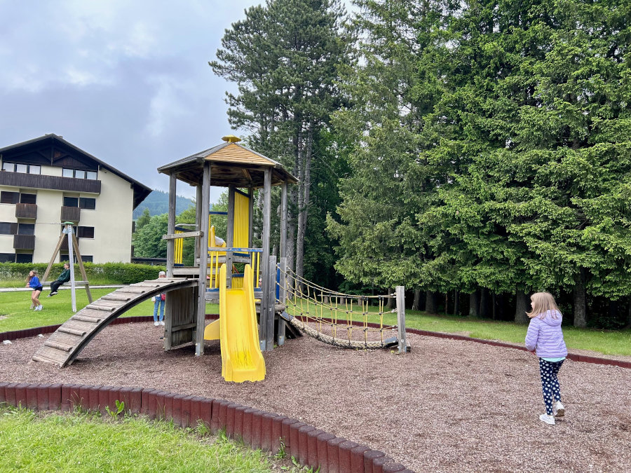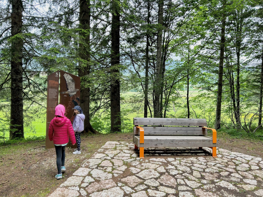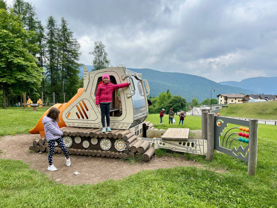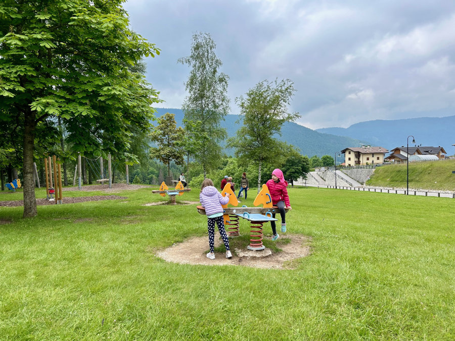 Ad un certo punto, all’altezza dei campi da golf, incontrerete un bivio: svoltate a sinistra per proseguire con il giro attorno alla torbiera mentre a destra per raggiungere Maso Spilzi. Noi abbiamo scelto la seconda opzione, proseguito fino al centro di Costa e avanti fino a Folgaria. Lungo la strada si incontra un bel parco giochi con diverse attrazioni: carrucola, dondoli, altalene, un gatto delle nevi con scivolo, una struttura in legno con ponti, corde e scivoli.