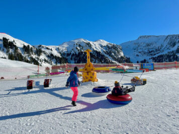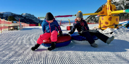 Per quanto riguarda l’esterno, molto soleggiato, mette a disposizione dei bambini castelli, scivoli e molti giochi. Carina l’idea di utilizzare, paletta e secchiello anche sulla neve. Trovate una lunga pista dove scivolare a tutta velocità grazie alle palette fornite dal parco. Per la risalita un comodo tapis roulant, vi porterà presto al punto di partenza. L’attrazione più apprezzata è però la giostra con i gommoni: un vero spasso!