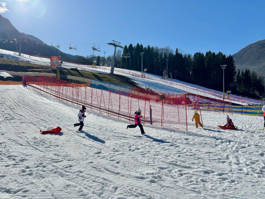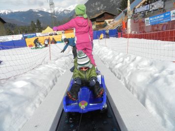 In fondo alle discese si trovano comodi pouf dove mamme e papà possono rilassarsi, godendosi un po’ di sole e guardando i propri figli in tutta tranquillità. Se volete divertirvi con la slitta ricordatevi che per i bambini il casco è obbligatorio.