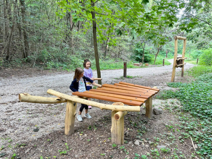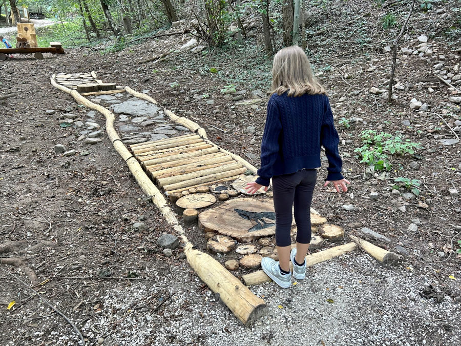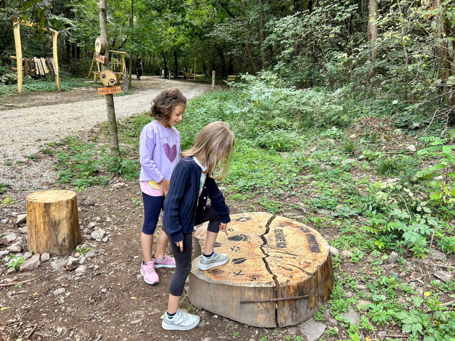 Le tappe sono molto vicine, i piccoli potranno muoversi in autonomia ed essere sempre visibili. Oltre che andare avanti e indietro un’infinità di volte. Si inizia con delle sculture in legno che rappresentano delle fiabe, saprai riconoscerle? E si passa alle orme degli animali che abitano il bosco: osserva bene le impronte sugli alberi e poi mettiti alla prova con il grande tronco. Chi avrà più memoria?