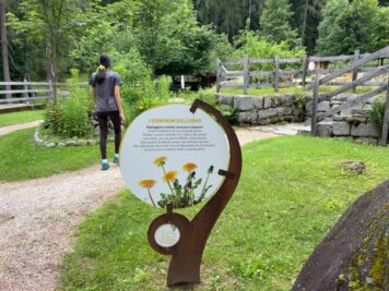 Volete sapere quale opzione abbiamo scelto noi? All’andata ci siamo lasciate guidare da Raimondo ovviamente! Abbiamo così scoperto come i diversi animali rompono i gusci delle nocciole, cosa significano i segni tracciati sui tronchi degli alberi, e tante altre cose. Si cammina nel bosco su sentiero a tratti stretto ma sicuro, tra sculture di legno e scorci sul castello di San Michele. Poco prima dell’ultima tappa si incontra anche un ponticello che attraversa un boschetto di felci.
