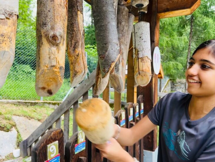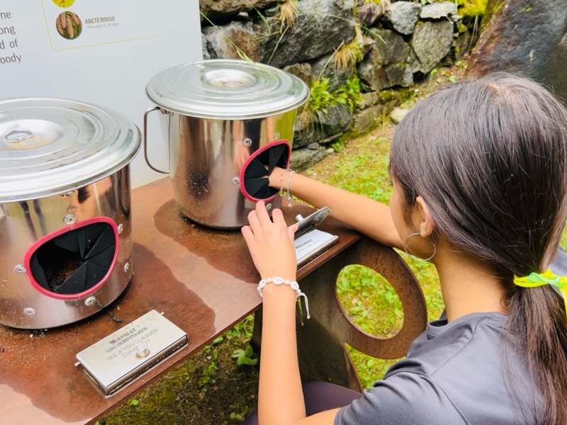 Superato il cancello che delimita il Bosco Derniga, troviamo varie postazioni che permettono di conoscere e sperimentare utilizzando i cinque sensi, la biodiversità del Trentino ed in particolare del bosco. Si trovano numerosi pannelli informativi, ma anche simpatiche idee che permettono ai bambini di essere protagonisti di questa scoperta. Nell’orto crescono verdure e piccoli frutti e grazie a un semplice gioco si deve indovinare quale erba aromatica si sta annusando (o assaggiando!). Poco oltre un altro esperimento simile: stavolta però i bambini devono usare il tatto per riconoscere i diversi tipi di pigne. E poi ancora, giochi con l’acqua ed un maxi xilofono realizzato con legno di diversi alberi.