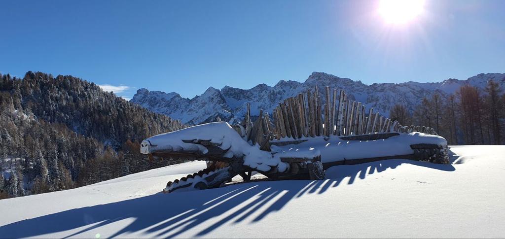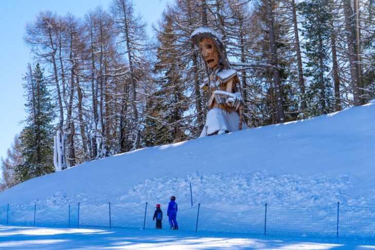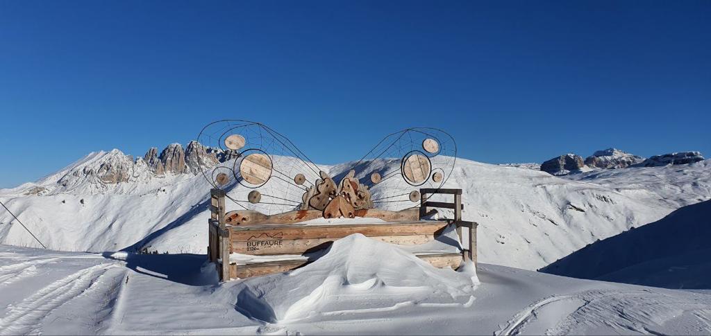Ma Buffaure non è solo sci e tanta splendida natura. Come dicevamo è anche un luogo impreziosito da tante opere di land art. Queste opere incuriosiscono i visitatori e rendono ancora più interessante questa località sciistica. Realizzate dall’artista Franz Avancini con materiali naturali e di recupero, tra cui legno di alberi abbattuti dalla tempesta Vaia, si possono ammirare lungo le piste, già fin dall’arrivo della telecabina.