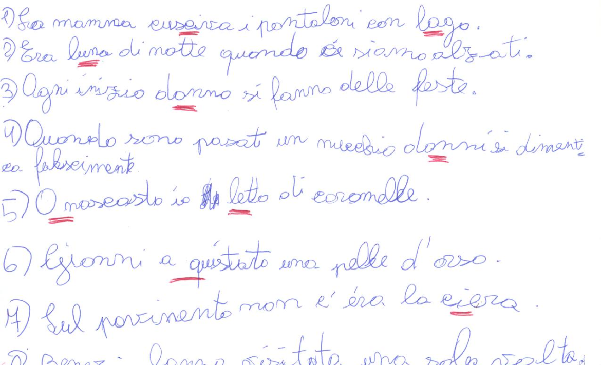 Ma non è così semplice! In verità l’italiano è una lingua SEMI-trasparente e, anche se i nostri ragazzini sono più fortunati rispetto ai coetanei tedeschi o francesi (la cui incidenza è doppia), la disortografia è una difficoltà molto presente e viva nelle nostre scuole! Questa caratteristica fa parte dei Disturbi Specifici dell’Apprendimento e porta ad una mancata automatizzazione dei processi ortografici della scrittura. Infatti i suoni (come la V/F) e la loro rappresentazione grafica non sempre trovano una corretta corrispondenza!Esempio di scritto di un paziente disortografico seguito da Lorenzo