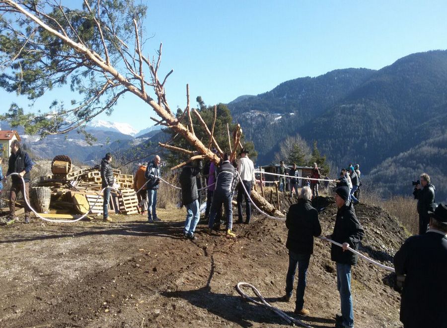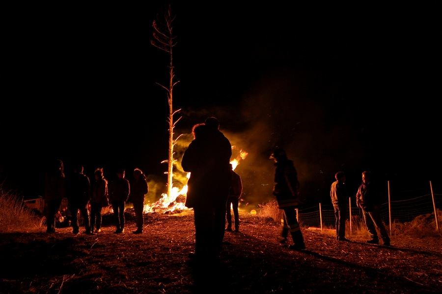 Che succede quindi al pino benedetto? Gli abitanti del paese lo trascinano fino alla bùsa del Carnevàl, dove viene “impagliato”. Al calar della sera, sempre lo sposo novello, gli dà fuoco e la serata prosegue con canti e danze attorno all’albero incandescente. Gli anziani del posto formulano pronostici sull’annata osservando la direzione delle scintille emesse dal falò.