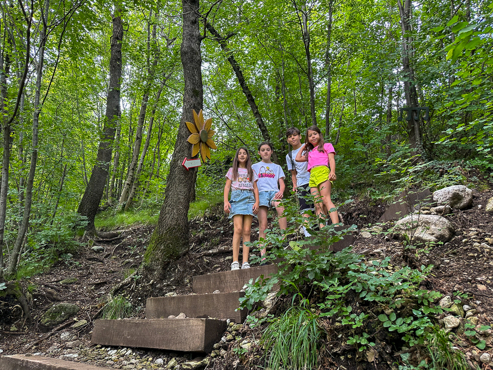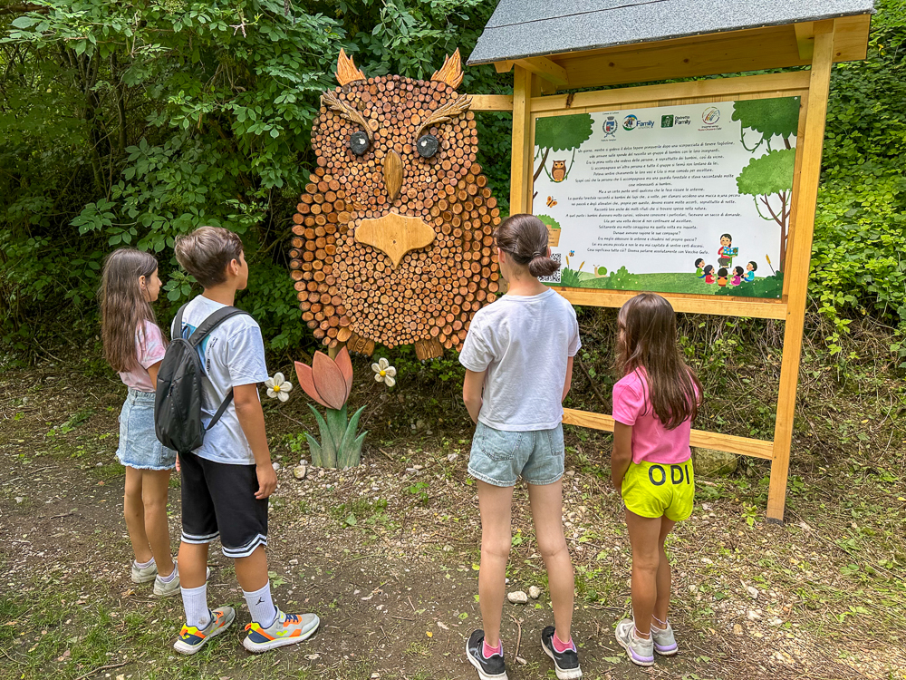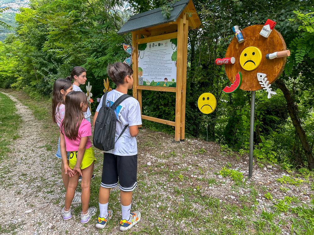 Da giugno 2024 il sentiero che porta alla cascata è stato infatti abbellito da pannelli su cui viene raccontata la storia di “Lila e la Magia del Bosco”. I pannelli sono accompagnati da otto installazioni artistiche composte con materiali naturali e di riuso, come legno e ferro. Interessante, e più insolito, anche l’utilizzo del vetro.