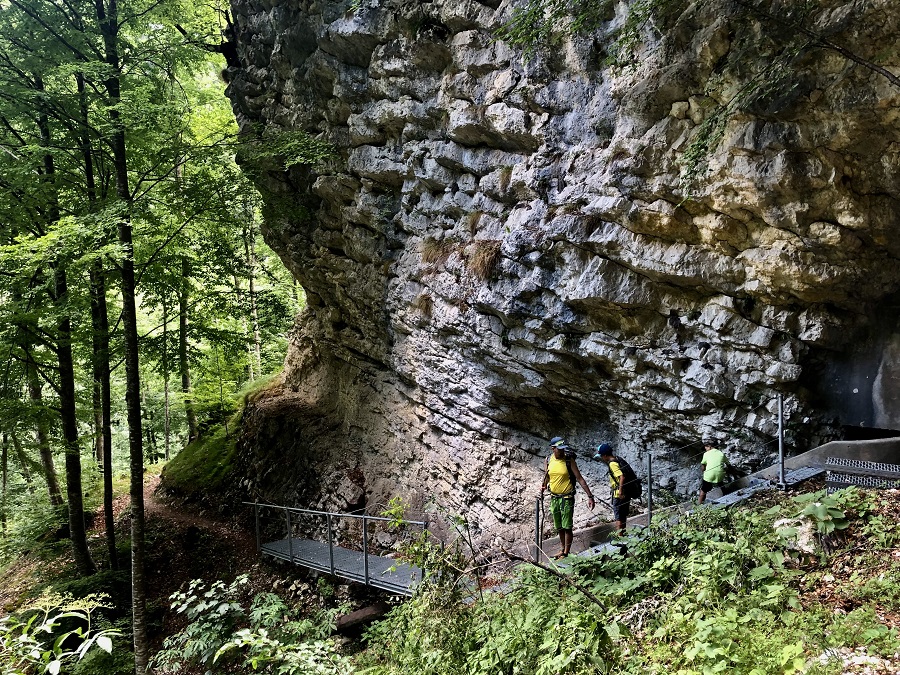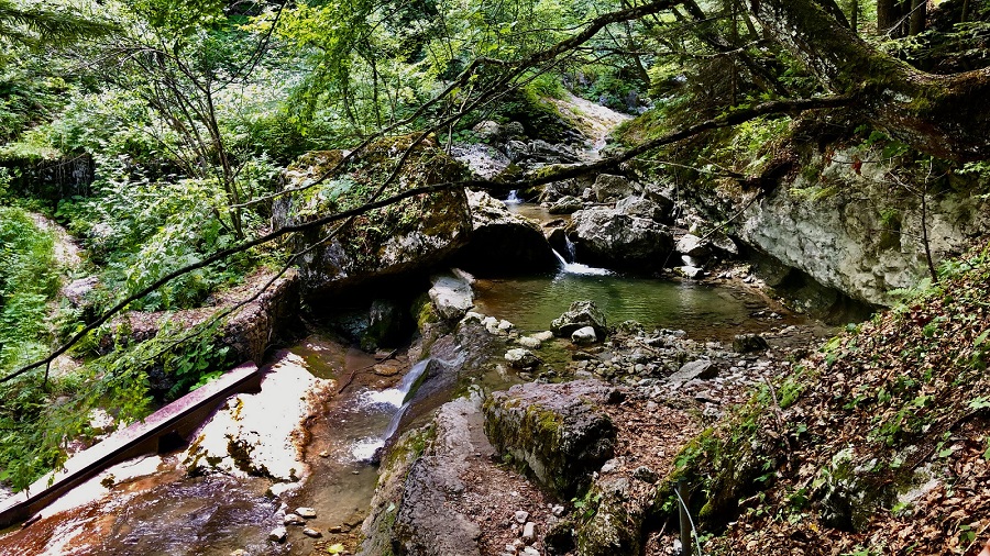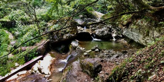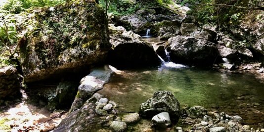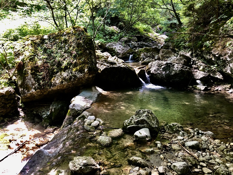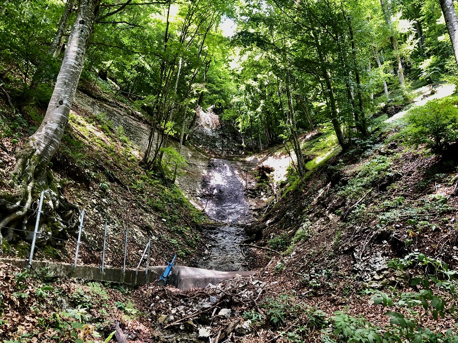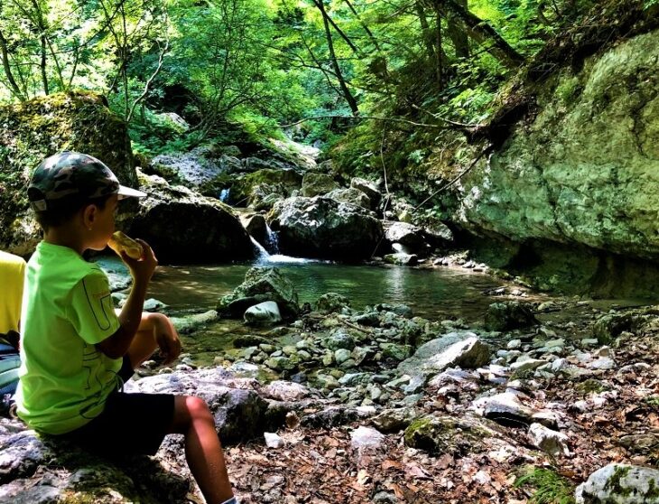 Ecco la prima cascata, purtroppo per via della siccità c’è pochissima acqua che scende, ma il sentiero è talmente suggestivo che non importa: troverete dopo poco una scaletta in ferro ben assicurata alla roccia dove scendere (tutto molto semplice anche per i più piccoli!).