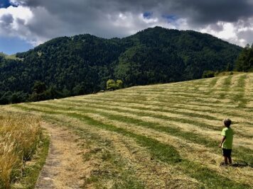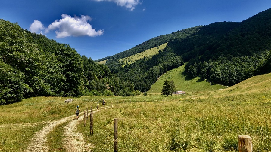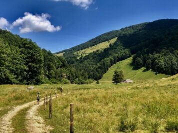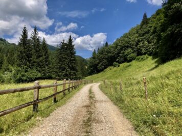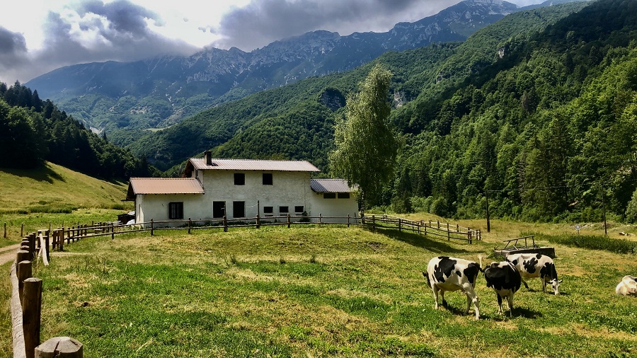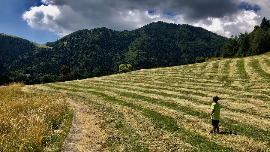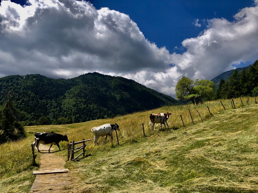 Si torna per poco sulla via dell’andata e si prende il sentiero a destra che si trova subito dopo il ponte (controllate il segnavia rosso sull’albero), lungo la discesa troverete diversi cancelli che si possono aprire in autonomia (ricordatevi di chiuderli!). Ci si abbassa un po’ di quota e il panorama cambia, regalando immensi prati che portano fino a Pian della Cenere e la sua malga.