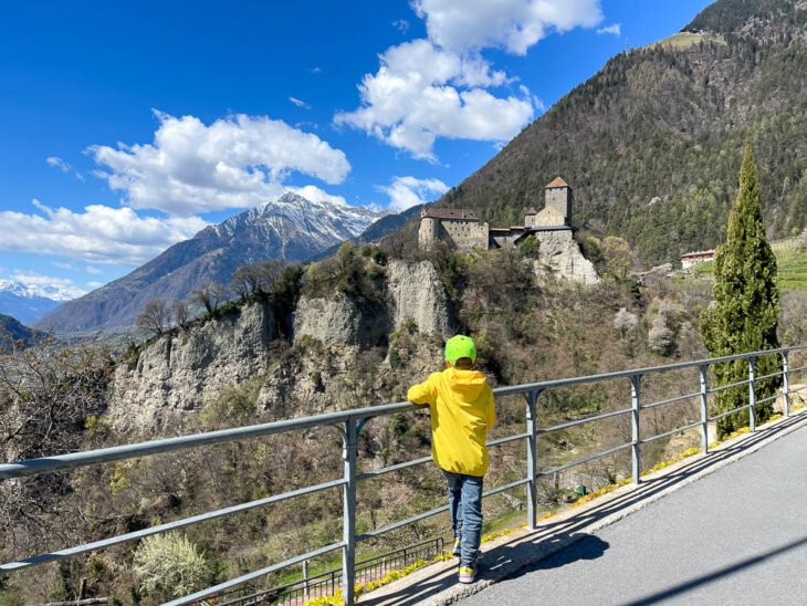La strada che porta a Castel Tirolo è chiusa al traffico: le auto possono essere parcheggiate nei parcheggi pubblici del paese. La passeggiata fino al castello si può fare con il passeggino, ma poi va lasciato all’entrata in quanto l’interno è pieno di ciottoli e scale.