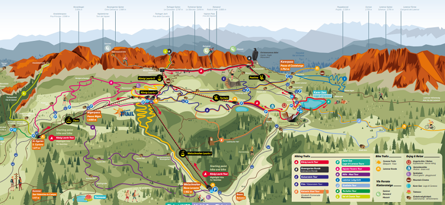 Si tratta di un percorso circolare di circa 3/4 ore di camminata ma con l’aiuto degli impianti il percorso ha un dislivello minimo. Si può partire sia dal lago di Carezza che da Nova Ponente o anche da Tires (funivia Cabrio) Il panorama che vi accompagnerà vi lascerà a bocca aperta, ecco il nostro racconto del Tour di Re Laurino.