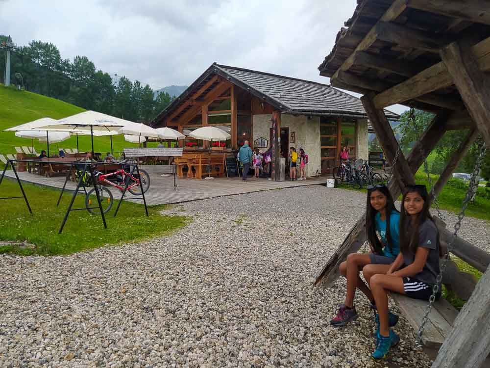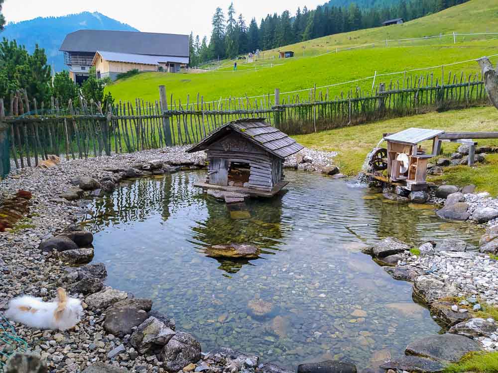 Lasciata l’auto di fronte a voi troverete subito l’Utia (rifugio) Paraciora, un ottimo punto d’appoggio se volete poi anche fermarvi per una merenda o per il pranzo. Il posto è molto carino, con un bel patio esterno e un piccolo parco giochi per i bambini. C’è anche un bel recinto con un laghetto dove si possono vedere anatre e coniglietti. La vista sul Sasso di Santa Croce, sul Lavarella e sul Conturines è meravigliosa, specie all’ora dell’enrosadira.