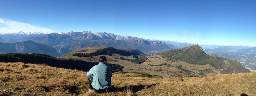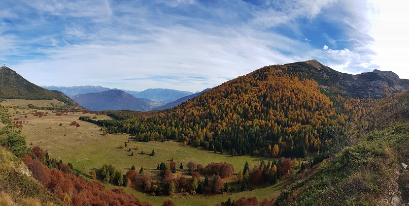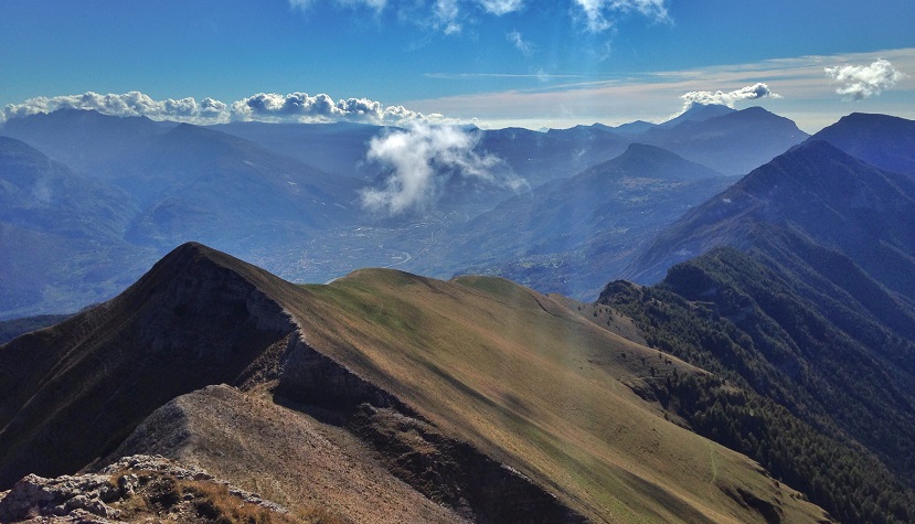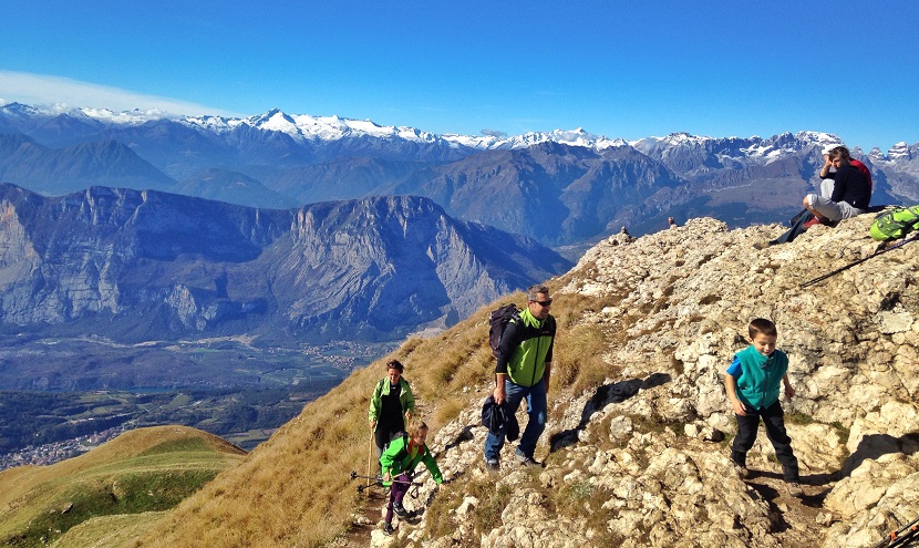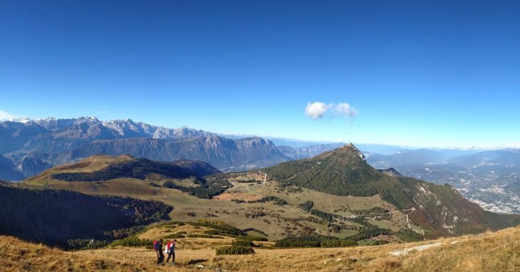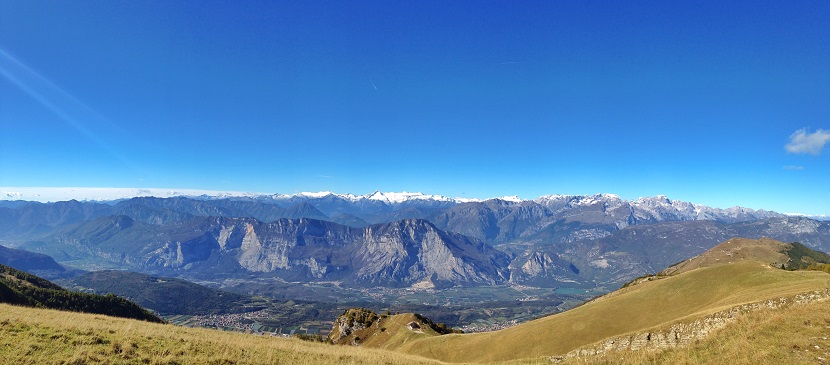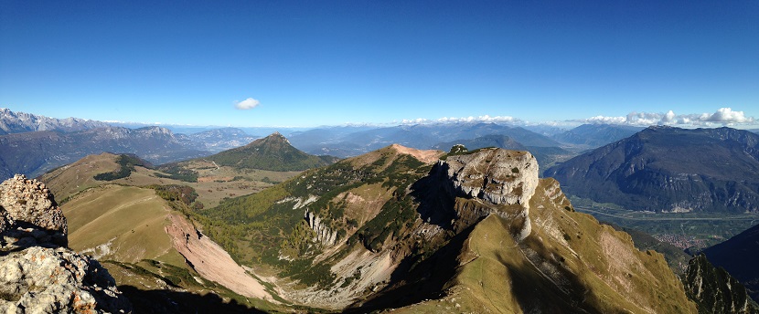 Sul basso la Valle dei Laghi, con il lago di Cavedine, Toblino e Santa Massenza che si cominciano ad intravedere man mano che si sale, mentre sullo sfondo il gruppo delle Dolomiti di Brenta e i ghiacciai dell’Adamello e Presanella. Da qui in un’oretta di salita costante ma non eccessivamente impegnativa si raggiunge la prima e la più alta delle tre cime il Monte Cornetto a quota 2180 metri.