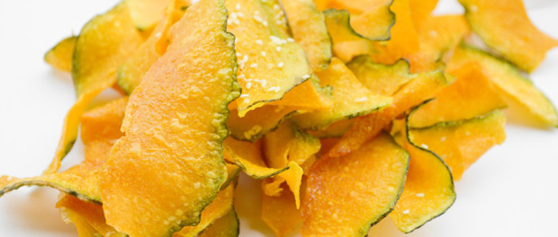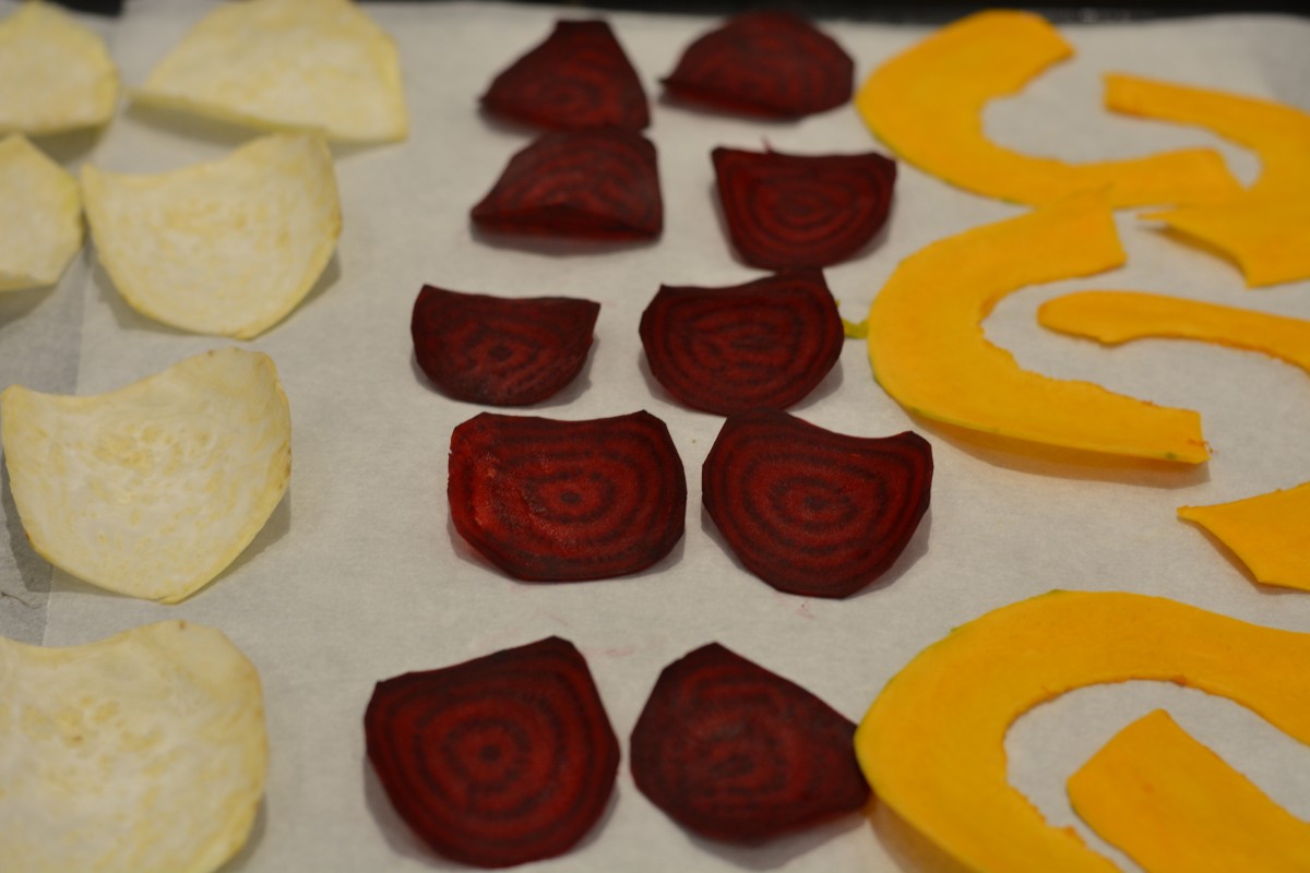 Preriscaldare il forno a 180° ventilato. Sbucciare le verdure e con una mandolina affettarle finemente. Rivestire una placca con carta forno e disporre le fettine di verdure. In una ciotolina versare il cucchiaio d’olio e mescolarlo con la spezia scelta. Spennellare ogni fettina di verdura con l’olio profumato. Infornare e cuocere per 15 minuti circa. A metà tempo aprire il forno e girare le singole fettine. Una volta cotte togliere dal forno e salare. Et voilà!