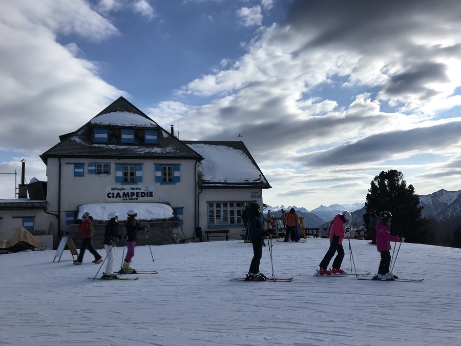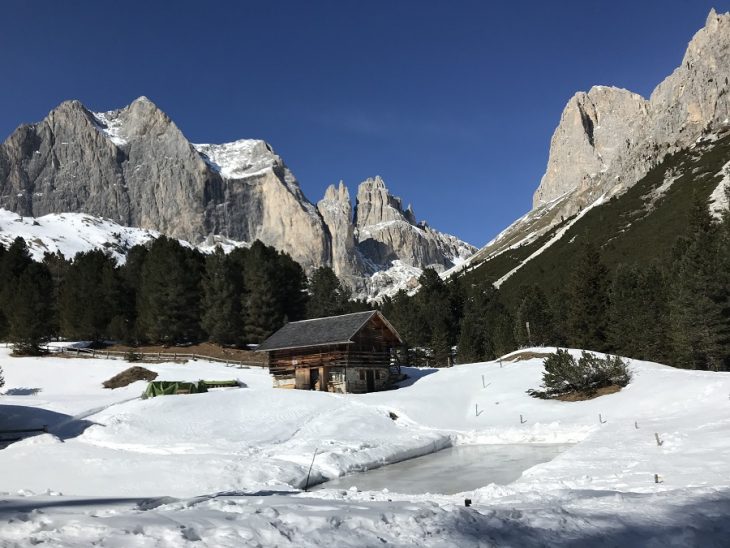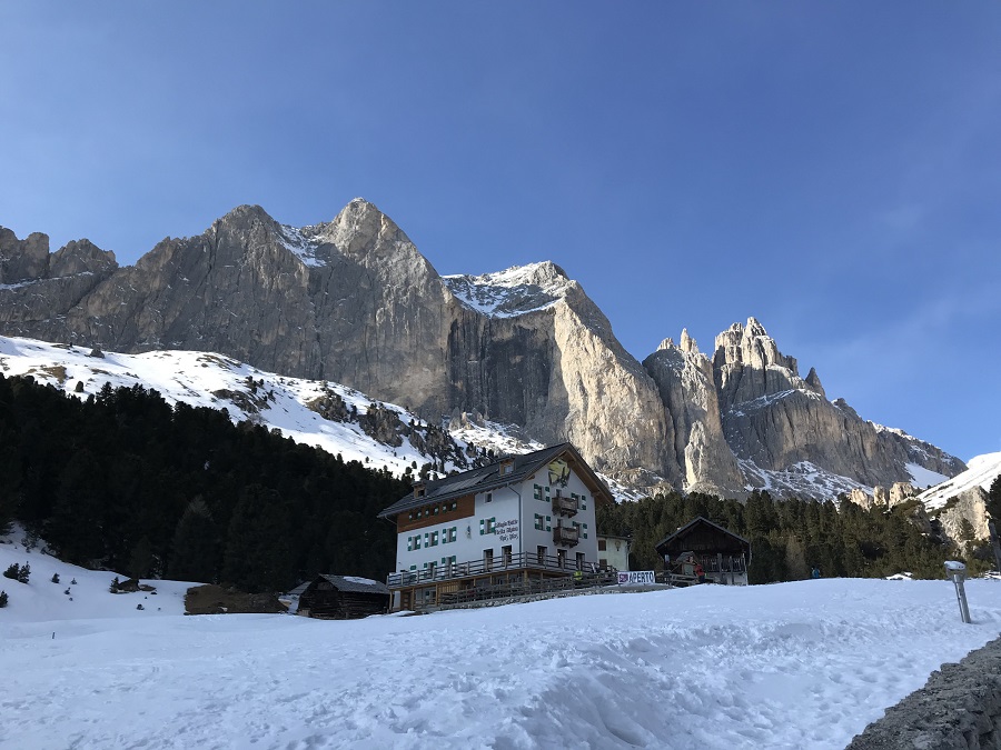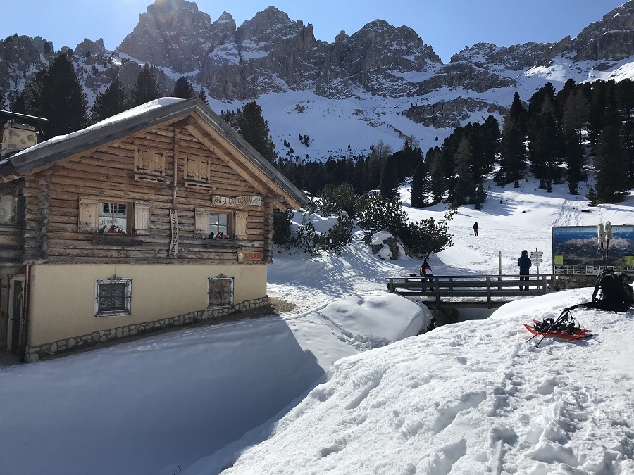 Il rifugio Vajolet è comunque chiuso in inverno quindi si torna alla conca Gardeccia per godersi il pranzo: noi ci siamo fermati alla Baita Enrosadira. Da fuori è proprio il classico piccolo rifugio di montagna: tutto in legno, con un’ attenzione minuziosa ai particolari.