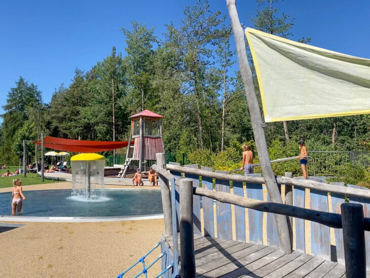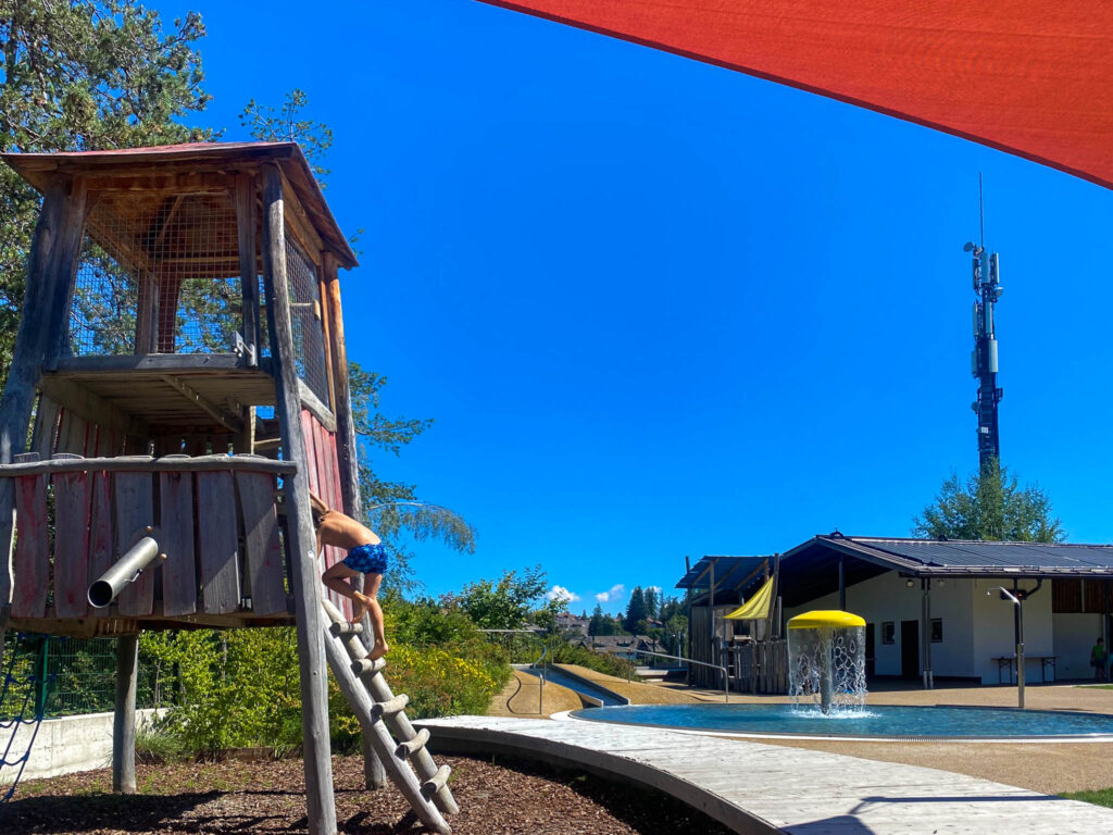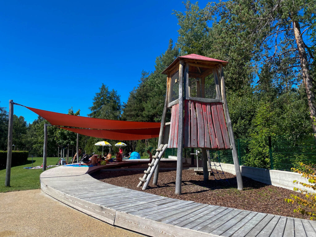 Per i bambini più piccoli c’è una vasca di circa 30 centimetri di altezza, con il fungo d’acqua ed uno scivolo poco inclinato che però fa divertire tutti. Lì vicino il veliero in legno con le reti per arrampicare e le scalette interne, dove lasciar spazio alla fantasia immaginandosi pirati. A poca distanza anche la torretta, per bambini più grandi, anche questa con reti e scalette e l’ultimo piano protetto da una grata, vista l’altezza.