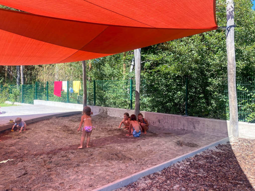 Bella la grande sabbiera, coperta da un telo che la rende ombreggiata, in cui fermarsi a riposare un po’ tra un tuffo e l’altro, magari portandosi anche paletta e secchiello.