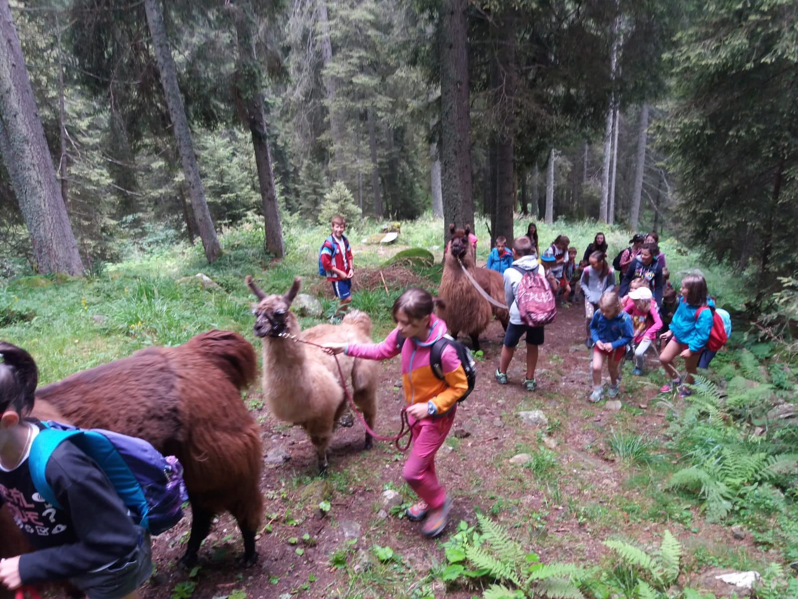 Noi siamo partiti in tarda mattinata e, dopo aver ricevuto da Eric consigli ed istruzioni per condurre i lama a passeggio, ecco subito intrapreso il bel sentiero nel bosco che con pochi tratti in salita porta al lago.