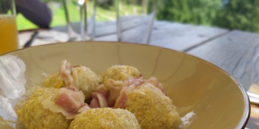 Di ritorno dalla deviazione per la cascata si riprendono al guinzaglio gli amici lama e si fa rientro alla malga, più o meno verso le 12, in perfetto orario per gustarsi un ottimo pranzetto all’ombra dei gazebi. Noi abbiamo provato gli gnocchi di polenta ripieni al Casolet e i tortei di patate con affettati e formaggi: gnam!