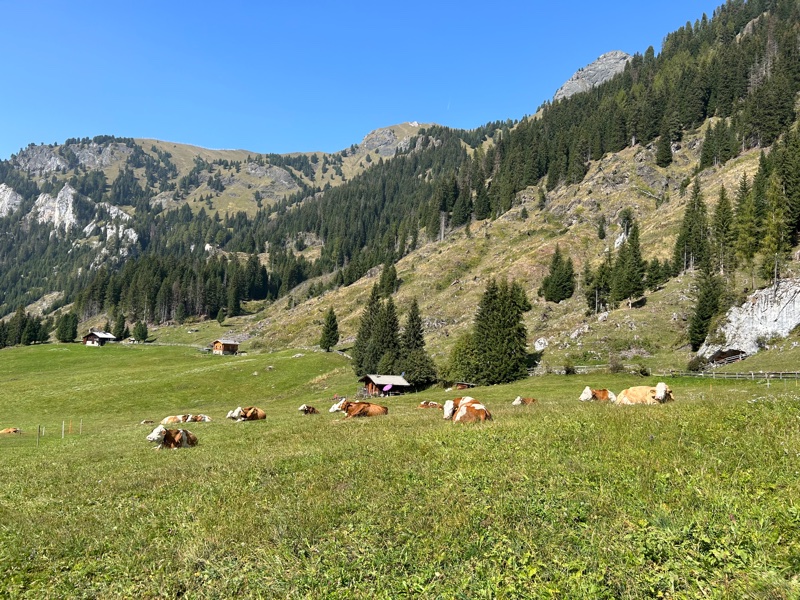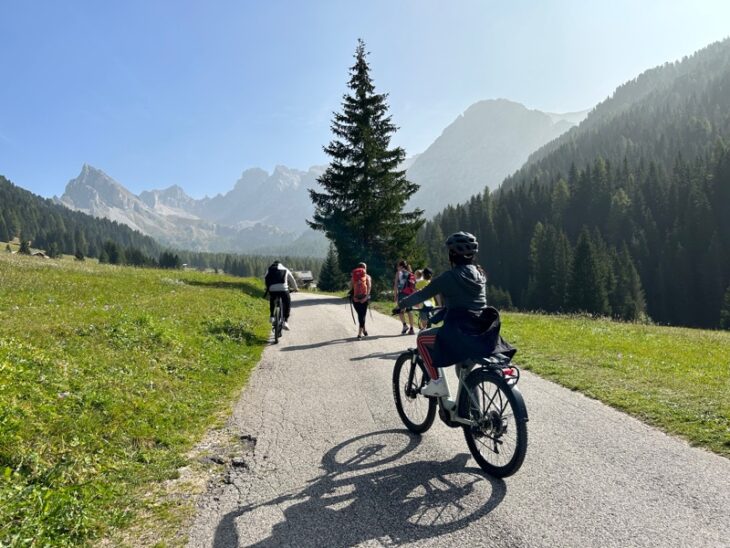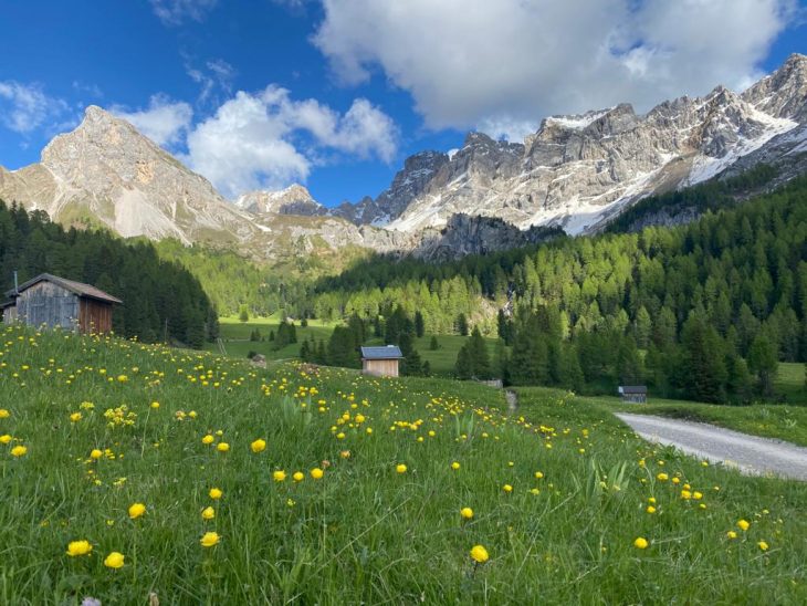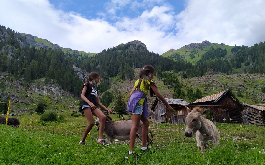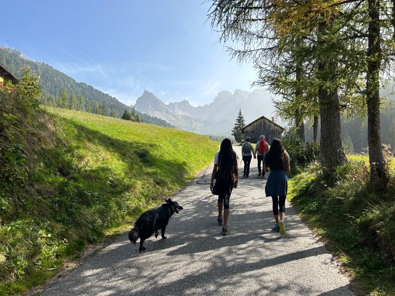Questo percorso si snoda tra radici e ponticelli, con lo scrosciare dell’acqua a farvi da compagnia. Si tratta della cosiddetta “Strada dei Russi” perché costruita dai prigionieri russi durante la prima Guerra mondiale. Passando per un’ampia pietraia alluvionale ci siamo infine riportati sul bivio incontrato all’andata e quindi alla Baita Ciampiè (un’oretta di cammino). Merita una sosta anche la Malga Mezzaselva, dove è possibile acquistare formaggi, burro e panna prodotti con latte locale. Ecco le loro mucche che prendono il sole beate!
