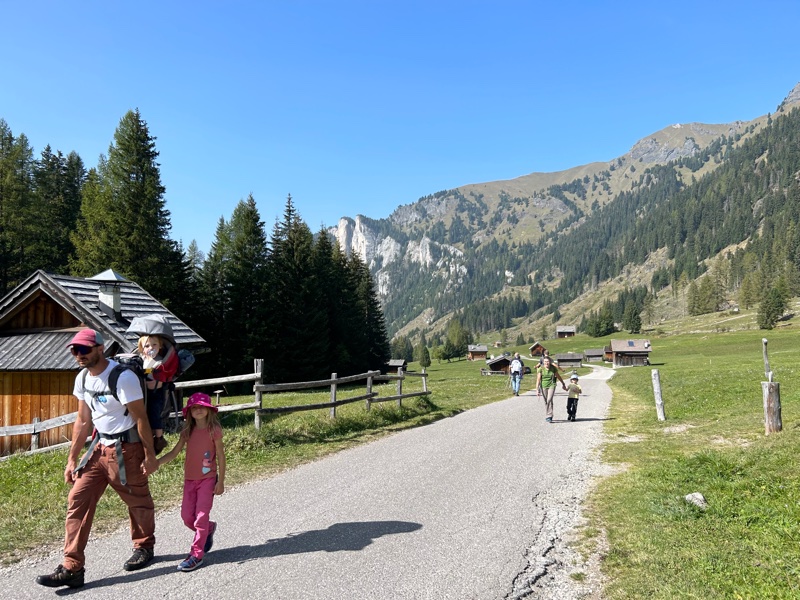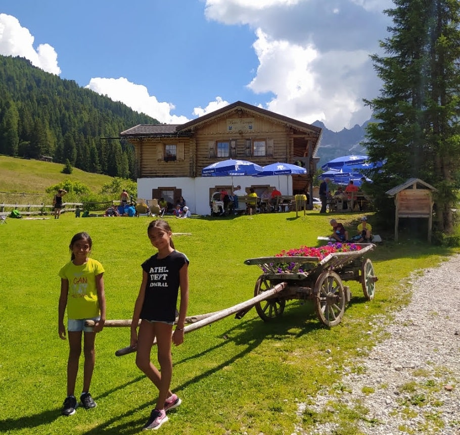 Per chi invece volesse provare un percorso alternativo, la Val San Nicolò si può raggiungere anche partendo dal Buffaure. Il sentiero, tutto in discesa nel bosco e con tratti un po’ scivolosi e poco adatti ai bambini piccoli (intraprendetelo solo con bambini grandicelli e svegli) vi porterà dapprima ad un incredibile punto panoramico (tenete i bambini sempre per mano!) e poi, a scendere fino alla Baita Ta Ciajaa, in circa un’ora o poco più.