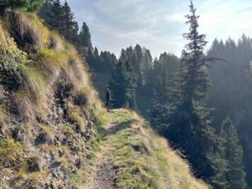 Da qui la strada diventa sterrata e si fa leggermente più ripida, ma sempre facile, sia per i bambini che con eventualmente il passeggino da trekking. Al bivio abbiamo proseguito attraverso il bosco sul sentiero 608, trovando così anche un po’ di riparo dal sole.