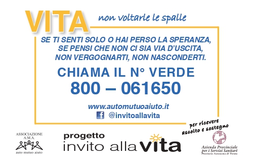 - Linea telefonica Invito alla vita – 800 061650 – Nata come punto di riferimento per persone in situazione di grande sofferenza e difficoltà (nell’ambito di un progetto di prevenzione del suicidio), in queste settimane ha ampliato la propria disponibilità di ascolto e sostegno a tutti coloro che si sentono soli e preoccupati per l’attuale situazione. La linea è gestita da volontari adeguatamente formati.