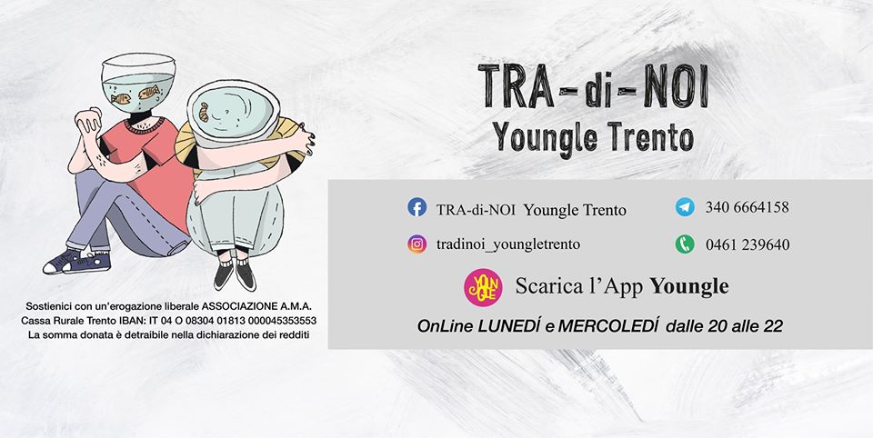 - Tra-di-noi Youngle Trento. Spazio on line rivolto ai giovani fino a 30 anni, (che di certo faticano a stare chiusi in casa – con i genitori! – e scalpitano per incontrare amici e fidanzati), dove possono entrare in contatto con altri ragazzi e ragazze della loro età, formati all’ascolto digitale, con cui poter condividere vissuti, emozioni e pensieri. In questo periodo, oltre che nei giorni indicati, lo spazio on line è attivo anche il venerdì sera.