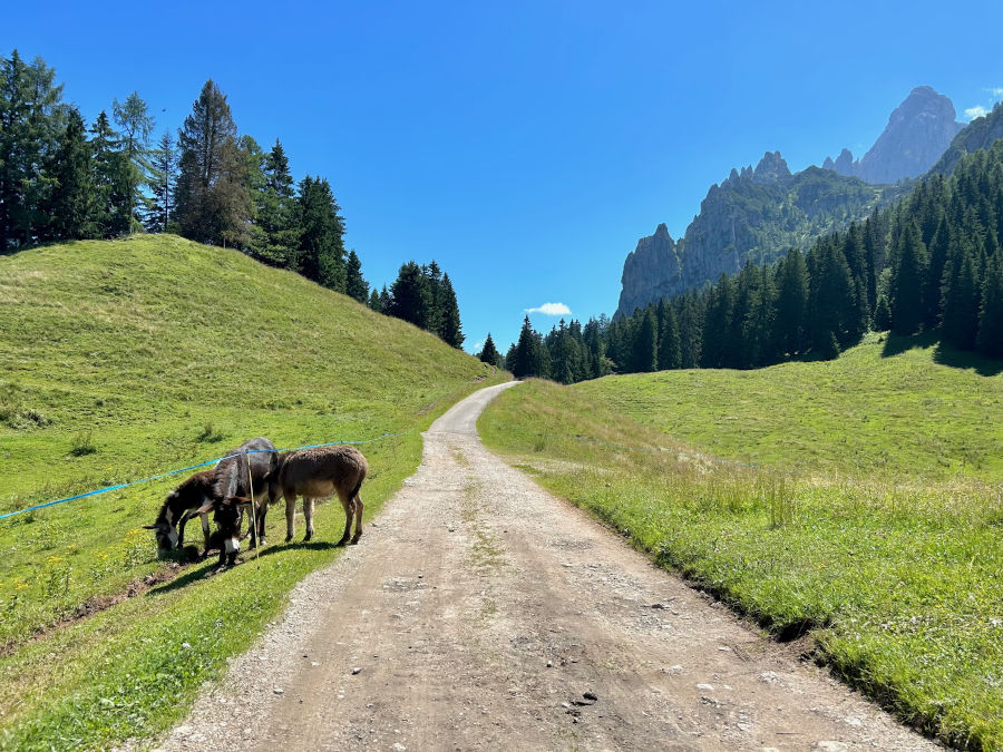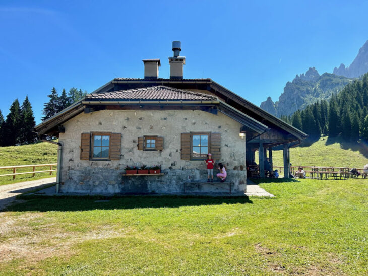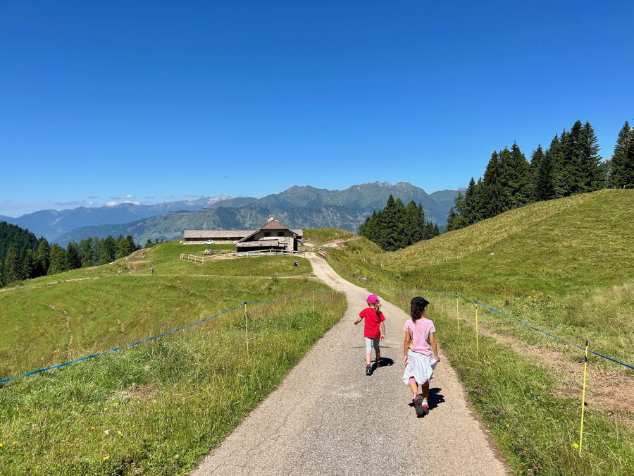 La strada è sempre in costante ma fattibile salita: si percorrono ben 11 tornanti, ai bambini piacerà molto tenere il conto e raccogliere qualche fragolina! Ancora un po’ di pazienza e non appena usciti dal bosco ecco in lontananza tra ampi prati malga Fossetta (1.556 metri) incorniciata dalle cime del Primiero e dalle Pale di San Martino. Che spettacolo!