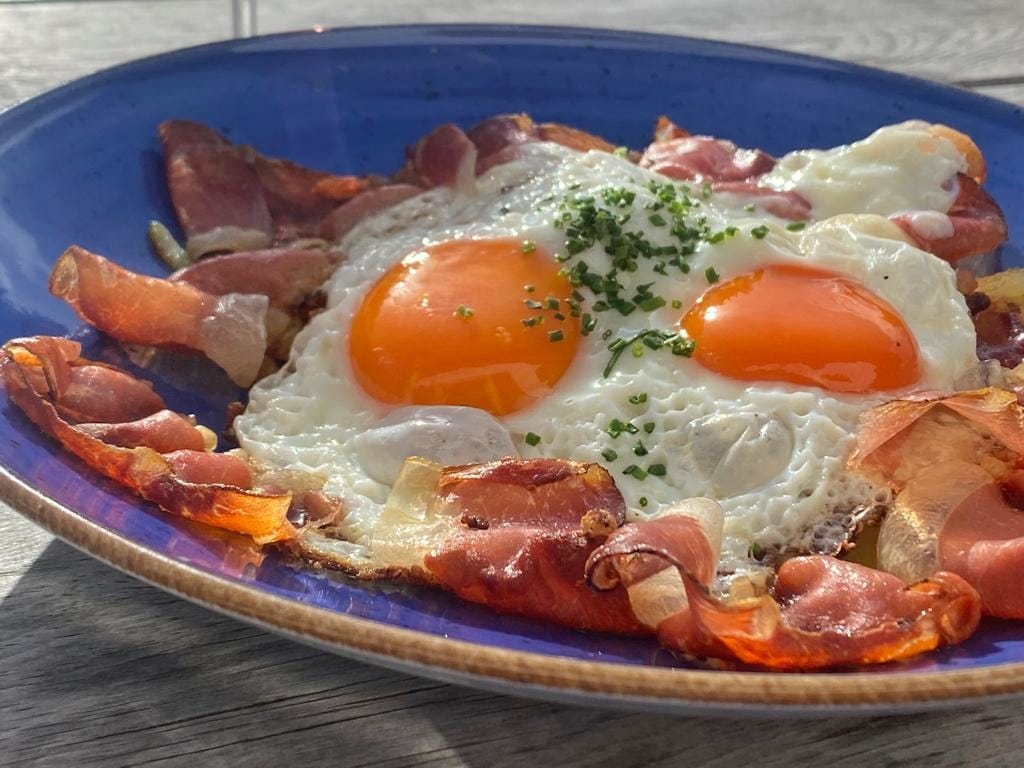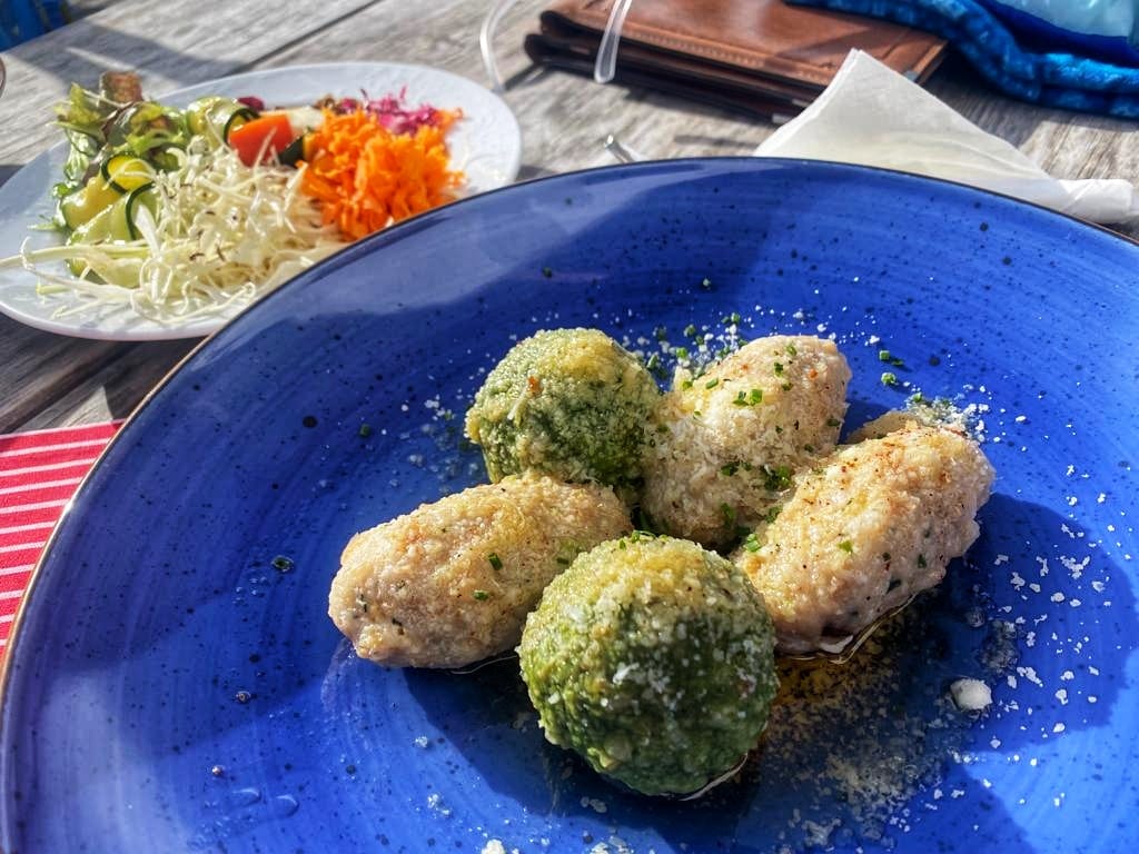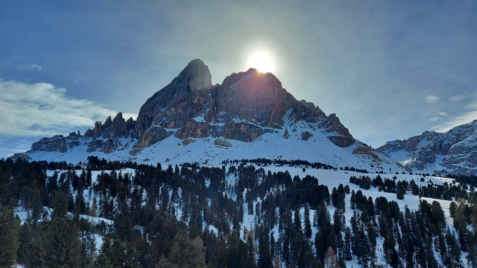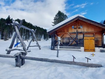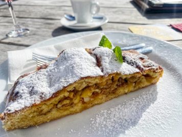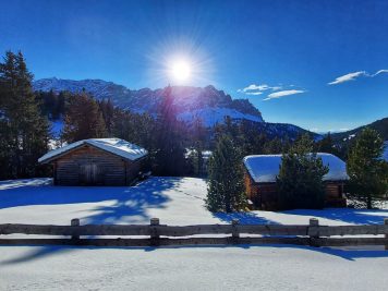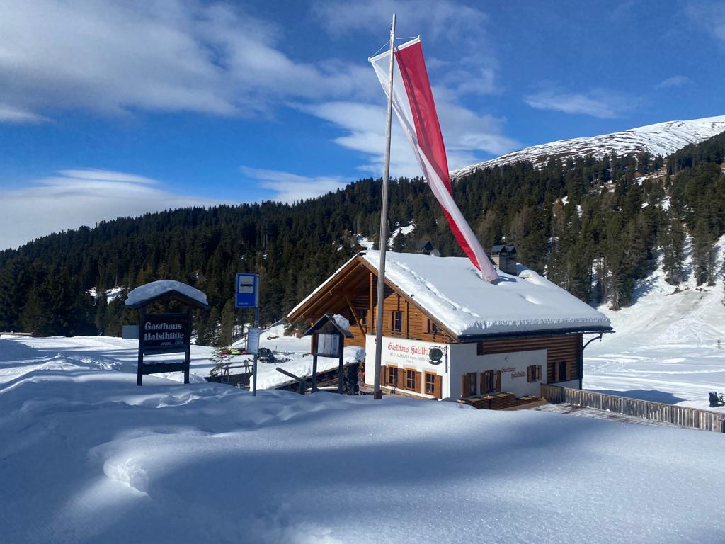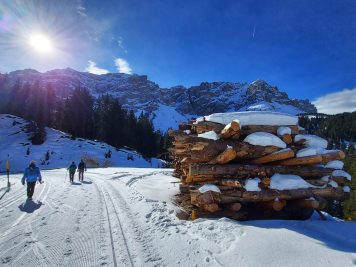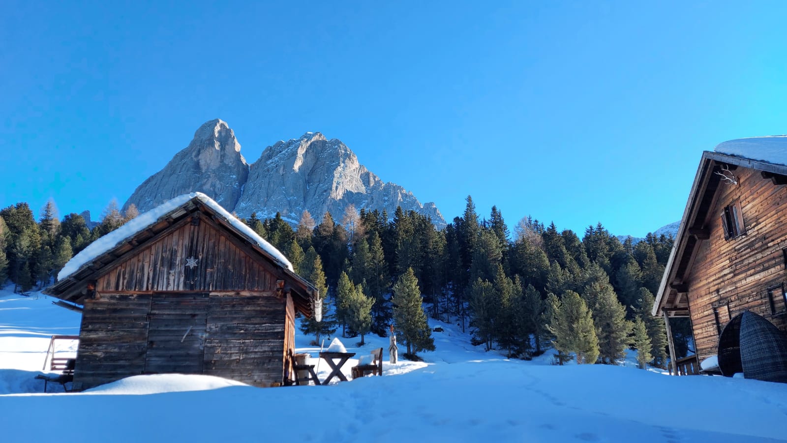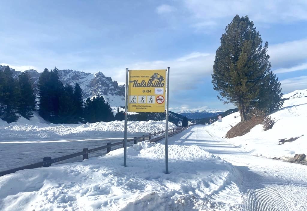 Dopo circa un’ora e mezza di escursione si arriva al rifugio Halslhütte (aperto in inverno solitamente da Natale a metà marzo, giorno di chiusura lunedì), situato proprio sotto le montagne del Gruppo delle Odle. Luogo ed ambiente accogliente, si può pranzare sia all’interno che all’esterno. Noi abbiamo approfittato di una bella giornata di sole e delle calde copertine messe a disposizione dalla struttura. La cucina è quella tipica altoatesina con prodotti fatti in casa. Tra i piatti assaggiati lo Spiegelei (speck, patate e uova), degli ottimi canederli al formaggio ed erbette con burro fuso e una deliziosa fetta di strudel.